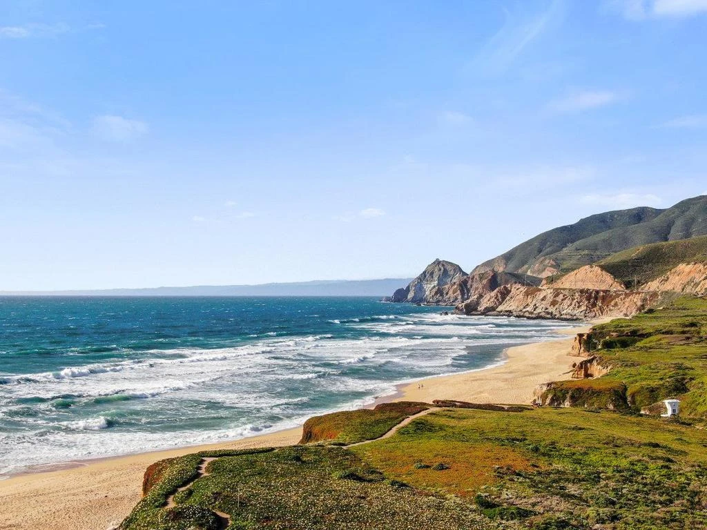 Captivating coastal retreat, built in 2011 and thoughtfully updated, this home offers Pacific Ocean views, sunset vistas, and a detached guest cottage, on a beautifully landscaped lot just blocks from the beach and coastal trails. The light-filled living space features an open floor plan with windows on three sides. The main level boasts contemporary flooring, recessed lighting, and a custom AV system, perfect for entertaining. The chef's kitchen is equipped with stainless steel appliances, a gas range, and ample cabinetry. A powder room, dual access to the landscaped yard, and the finished 2-car garage complete this level. Upstairs, the primary suite is a tranquil sanctuary with ocean views, a walk-in closet, and an en-suite bathroom featuring a large shower and cherry vanity. The guest suite also offers high ceilings and access to a full bath. Outside, enjoy a wrap-around space with native plantings, hard-scape pathways, and cafe lights creating a magical ambiance. The standalone cottage is perfect as an office, or guest space, and the outdoor shower is perfect for rinsing off after a day at the beach. Located in Montara, this property offers an idyllic retreat, connected to nature, and is just 15 miles south of San Francisco.