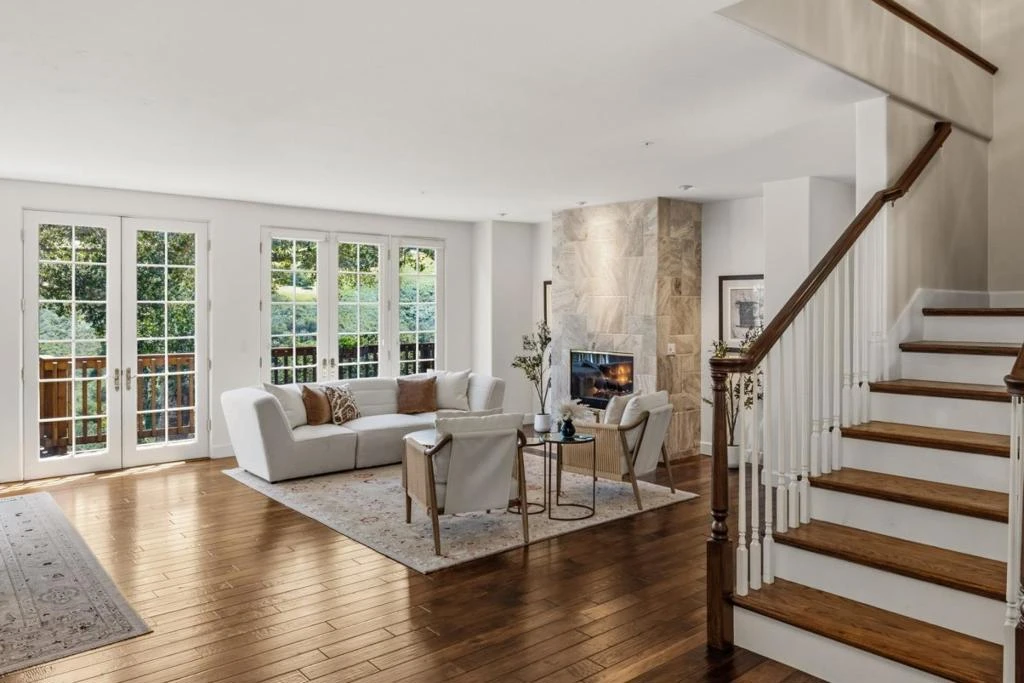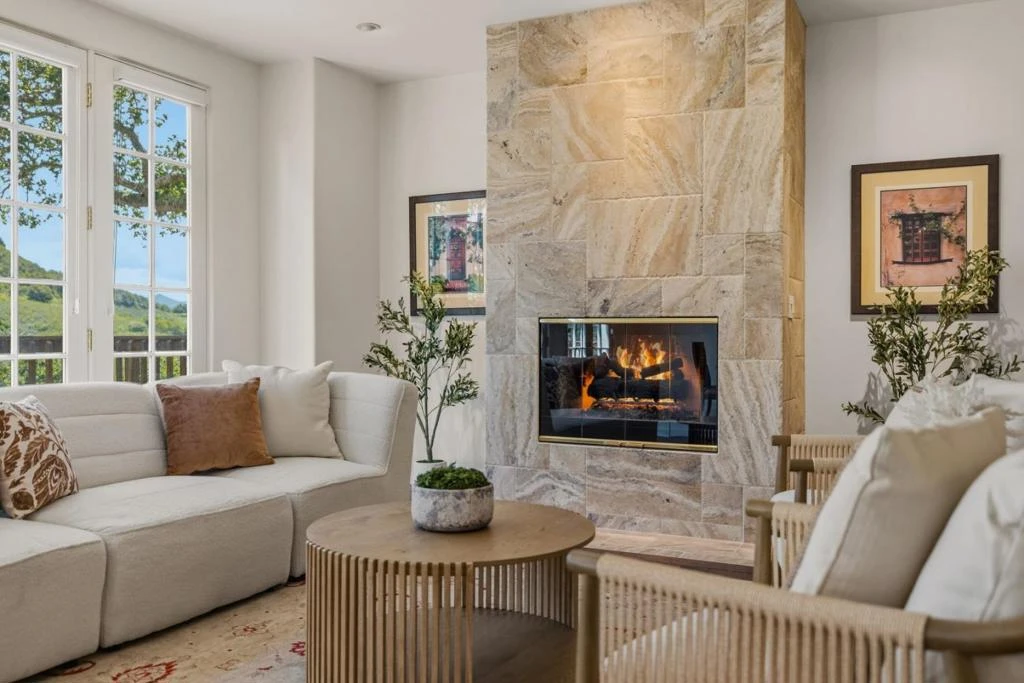 Perched above the Monterey Peninsula in a coveted gated community, this exceptional estate offers breathtaking panoramic views of rolling hills and lush oak-studded canyons. Set in the sunbelt of the Peninsula and on a sprawling private parcel surrounded by mature Oaks, the home blends timeless charm with refined California living. The stately two-story facade welcomes you with a covered front porch, manicured drought-tolerant gardens, and classic green shutters. Inside, rich hardwood floors, soaring ceilings, and abundant natural light set an elegant tone throughout. The gourmet chef's kitchen features a large center island, granite countertops, premium stainless appliances, and custom white cabinetry. The open-concept great room flows seamlessly to the dining area beside a dramatic stone fireplace. The conveniently located main-floor primary suite offers privacy and ease of living. A bright formal living room with a floor-to-ceiling marble fireplace opens through French doors to the expansive rear deck, a true entertainer's paradise. Soak in golden sunsets from the oversized spa, dine al fresco beneath the oaks, or simply take in the sweeping canyon views. This is Monterey living at its finest: private, peaceful, and utterly spectacular.