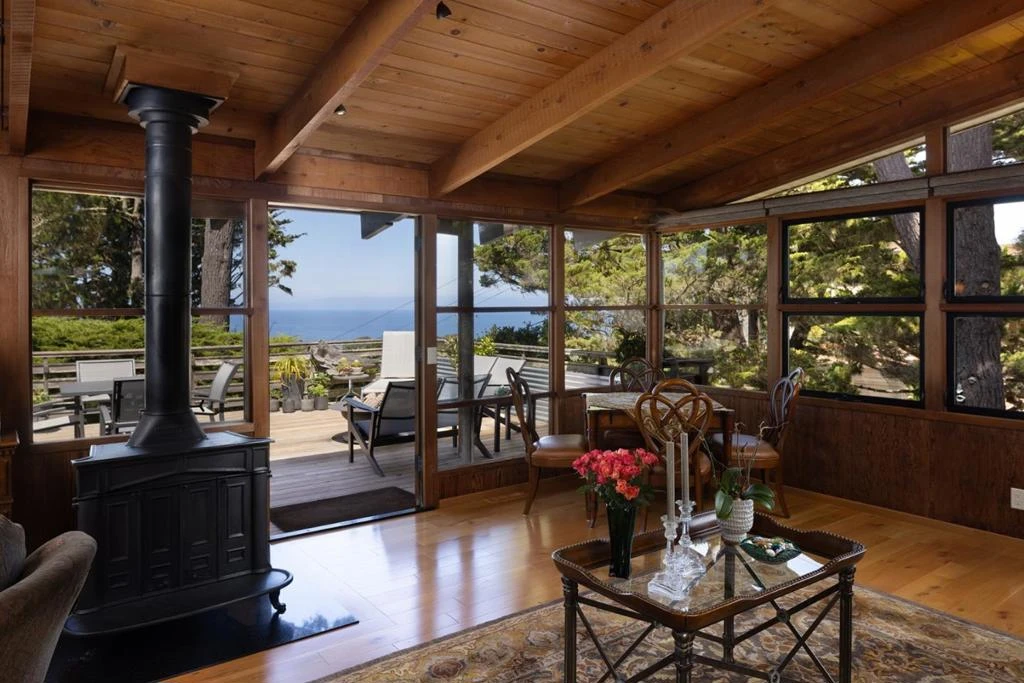 Perched on a hand-selected double lot with what may be the finest ocean views in New Monterey sits this architectural gem designed by famed local architect John Gamble, known for his mastery of seamlessly blending mid-century modern design with natural elements. Rarely does a home of this caliber and character come to market; only the third owners since its creation have lovingly restored and thoughtfully updated it, while preserving its timeless character. French doors frame sweeping views of the Monterey Bay and Pacific Ocean. Warm oak engineered wood floors flow through the main living spaces, complemented by the original cast iron fireplace now burning gas. The open floor plan centered around the view includes a remodeled chefs kitchen featuring granite counters, Wolf appliances, and new designer lighting, while a large deck with a built-in fire pit extends the living space outdoors for unforgettable sunsets. If the 3 bedrooms and 2 and a half baths aren't enough, there is a newly built ADU with ocean views, radiant heat, Caesarstone counters, full kitchen with custom cabinetry, ceramic tile floors, and a sleek bath ideal for guests, rental income, or extended family. Extra parking and a paver driveway accommodate both residences, along with two storage sheds for convenience.