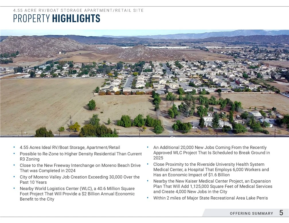 - 4.55 Acres Ideal for Mini-Storage, Apartments or Retail - Possible to Re-Zone to Higher Density Residential Than Current R3 Zoning - Within 5 Miles of Lake Perris a State Recreational Lake - Close to the New Freeway Interchange on Moreno Beach Drive That was Completed in 2024 - City of Moreno Valley Job Creation Exceeding 30,000 Over the Past 10 Years - Nearby World Logistics Center (WLC), a 40.6 Million Square Foot Project That Will Provide a $2 Billion Annual Economic Benefit to the City - An Additional 20,000 New Jobs Coming From the Recently Approved WLC Project That Is Scheduled to Break Ground in 2025 - Close Proximity to the Riverside University Health System Medical Center, a Hospital That Employs 6,000 Workers and Has an Economic Impact of $1.6 Billion - Nearby the New Kaiser Medical Center Project, an Expansion Plan That Will Add 1,125,000 Square Feet of Medical Services and Create 4,000 New Jobs in the City -All Utilities Available and Nearby