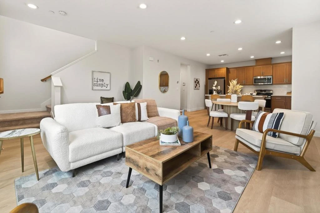 Gorgeous end unit townhome with spectacular new designer quartz kitchen counters and backsplash. Gas cooktop! Brand new LVP floors throughout the first floor and upstairs hallway. A generous master bedroom with ensuite and huge walk-in closet. Washer and Dryer Included, Dual zone heating and cooling, on each floor. Oversize 2-car parking garage with extra shelving. And enjoy the front patio for BBQ and warm dining. Beautiful and spacious townhome, located minutes from the heart of downtown Morgan Hill! Easy walk to restaurants, parks, farmers market, shopping, Caltrain, Apple & Google bus. Walking distance to Starbucks, Trader Joe's and Safeway. The community has a playground, picnic benches as well as a resident agricultural area. If you're feeling active, Coyote Creek Trail is just minutes away!