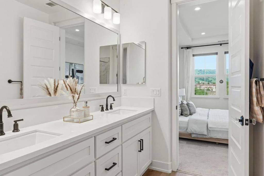 Step into modern comfort in this beautifully maintained 3-bed, 3.5-bath newer construction home in Morgan Hill with award-winning schools. Built in 2022, the home offers just under 1,700 SF of thoughtfully designed living space, including a first-floor bedroom with Murphy bed and full bath, ideal for guests, multigenerational living, or a home office. The chef-inspired kitchen features quartz countertops and a large island, opening to the family and dining areas to create an inviting space for everyday living and entertaining. Step outside to a spacious covered patio with serene east foothill and open-field views, perfect for relaxing or hosting. High ceilings, LVP flooring, a cozy freestanding fireplace, walk-in closet in the primary bedroom, and in-home laundry enhance comfort and functionality. Energy-efficient features include solar panels, dual-pane windows, Energy Star appliances, LED lighting throughout, and a smart thermostat to help reduce utility costs. An attached two-car garage with a Level 2 EV hookup adds modern convenience. Located just minutes from Trader Joe's, Starbucks, The Breakfast Club, Safeway, Hwy 101, and Morgan Hill's charming downtown, parks, and wineries, this move-in ready home offers an ideal combination of comfort, location, and lifestyle.