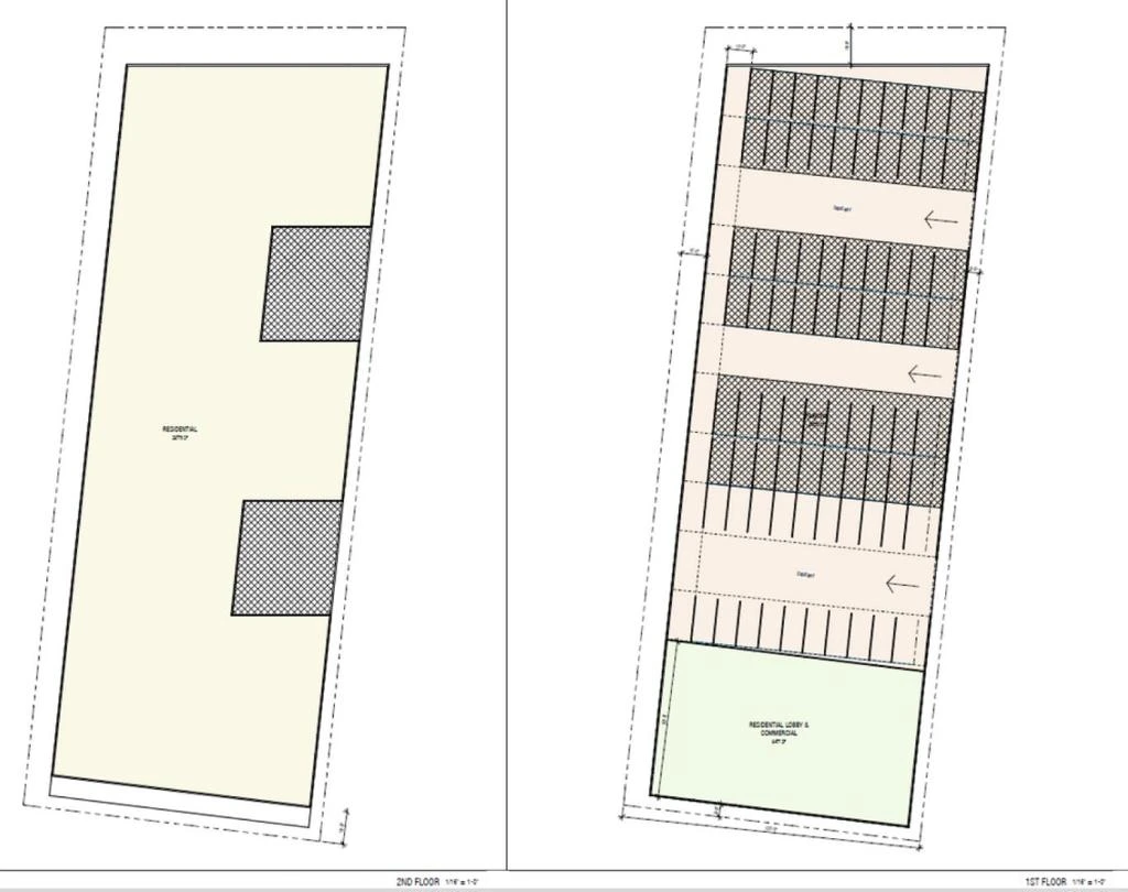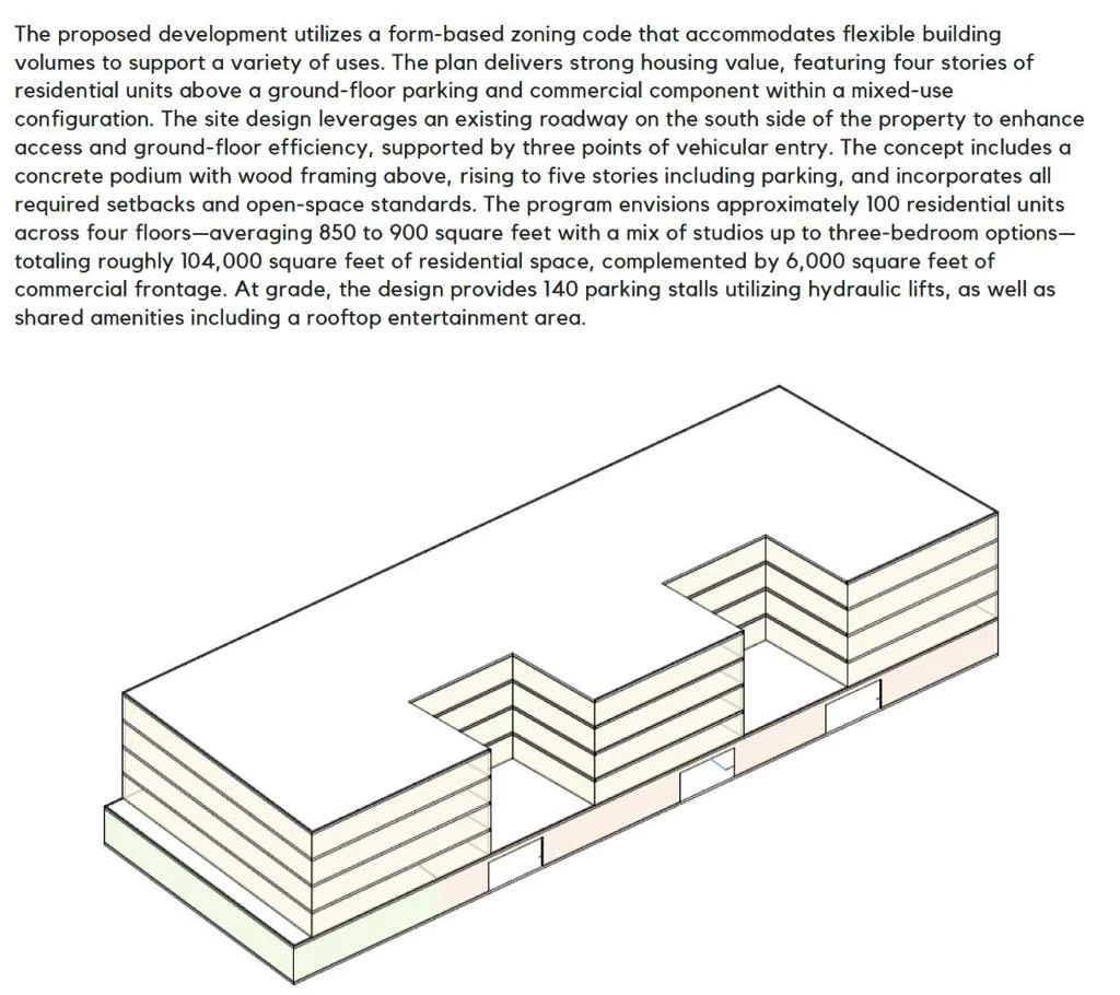 The proposed development offers two compelling housing options designed for modern living and strong community value. Option 1 features 23 three-story townhomes with spacious layouts, enhanced privacy, and a cohesive neighborhood feel, incorporating private yards and rooftop terraces for elevated outdoor living. The site plan maximizes efficiency by utilizing an existing southern roadway and includes three vehicular access points for improved circulation while meeting all setback and open-space requirements. Option 2 presents a mixed-use condo concept under a form-based zoning approach, with four stories of residential units above ground-floor parking and commercial space. This design includes approximately 100 units ranging from studios to three bedrooms, averaging 850 to 900 square feet, totaling about 104,000 square feet, along with 6,000 square feet of commercial frontage. Built with a concrete podium and wood framing above, the five-story structure incorporates 140 parking stalls with hydraulic lifts and shared rooftop amenities, delivering a flexible, efficient, and vibrant residential environment.