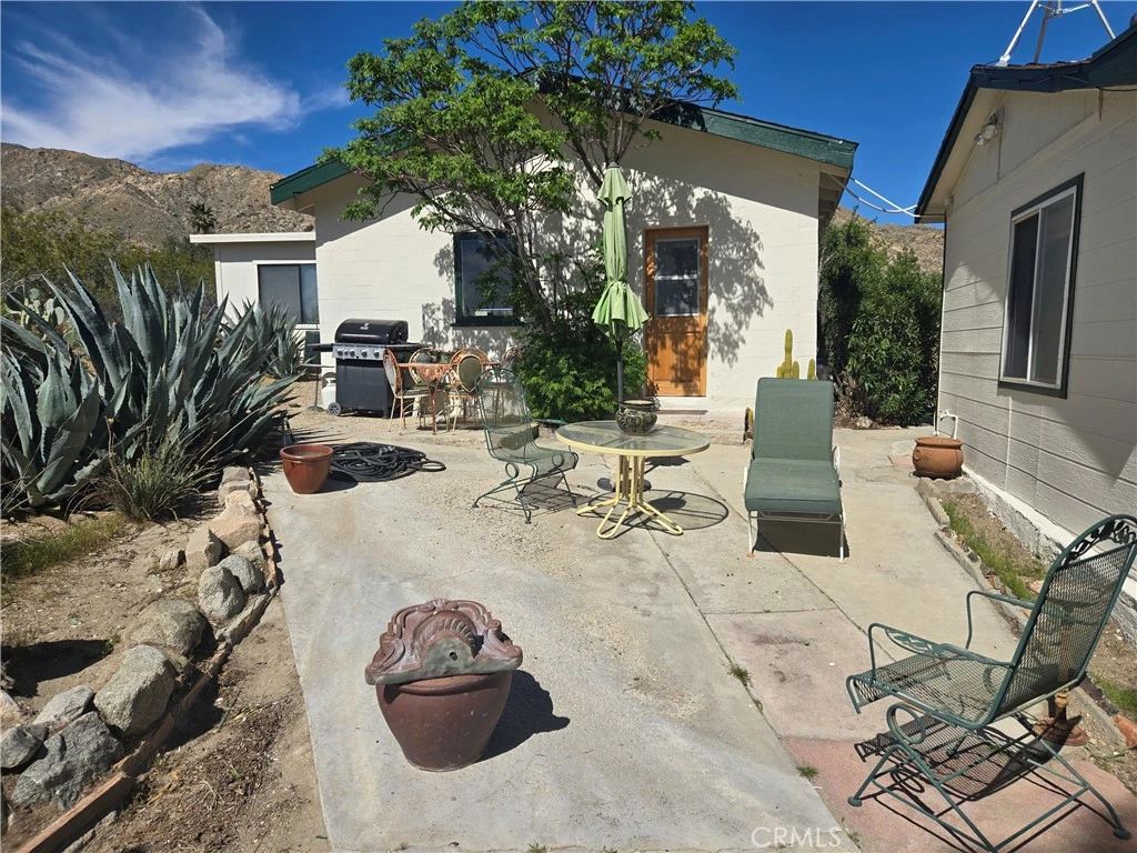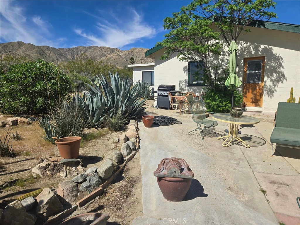 Escape to your own private desert retreat with this enchanting 2-bedroom, 1-bath cottage set on 2.5 fully fenced acres of breathtaking landscape. Surrounded by wide-open skies and panoramic mountain views, this property offers the perfect blend of cozy comfort and expansive outdoor living. Step inside to a warm and inviting living space anchored by a charming fireplace—ideal for cool desert evenings. Natural light pours through the windows, framing unforgettable views and creating a bright, airy atmosphere throughout. Outside, a thoughtfully curated cactus garden adds character and vibrant desert beauty, while the generous acreage provides privacy, room to roam, and endless possibilities. The entire exterior of the home has been freshly painted. The detached garage is currently being used as a studio, offering flexible space for art, work, or guests—with exciting potential to convert into an ADU for additional living space or rental income. Whether you're seeking a peaceful full-time residence, a weekend getaway, or an investment opportunity, this desert gem delivers charm, versatility, and unforgettable scenery.