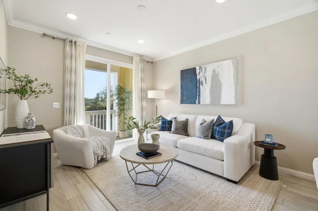 This 6-year-old Pulte-built townhome was originally a model home and offers a modern, light-filled layout. The home features two suites on the top level and a flexible office or bedroom on the entry level, along with 9-foot ceilings and approximately $70,000 in builder upgrades.The open-concept main living area includes two oversized balconies, a half bath, and a well-appointed kitchen with granite waterfall countertops, full backsplash, soft-close cabinetry, under-cabinet lighting, stainless steel appliances, and a gas range. Additional features include recessed lighting, crown molding, window treatments, dual-zone central AC, in-unit washer and dryer, and a tankless water heater in the finished garage. Conveniently located near Highways 237, 101, and 85, Central Expressway, Downtown Mountain View, Caltrain, and Light Rail.