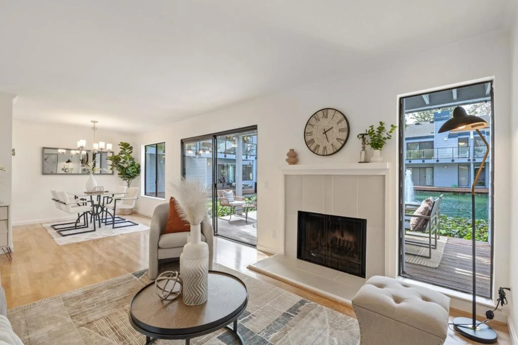 Waterfront Living at The Waters of Mountain View. Contemporary 2 bedroom, 2 bath ground floor condo with 998 sq ft of living space. Spacious living room with woodburning fireplace has sliding door to roomy deck overlooking the lake and fountains, perfect for your morning coffee or to wind down the day. Updated kitchen with garden window features newly refaced cabinetry. Quartz countertops and new stainless-steel appliances. Large primary suite with abundant closet space. Generously sized 2nd bedroom has walk-in closet. Freshly painted with laminate flooring in living, dining and kitchen and new carpet in bedrooms. Other features include inside laundry and one car garage. Complex amenities include pool, spa and tennis courts. Great location close to major Silicon Valley employers with easy access to local freeways.