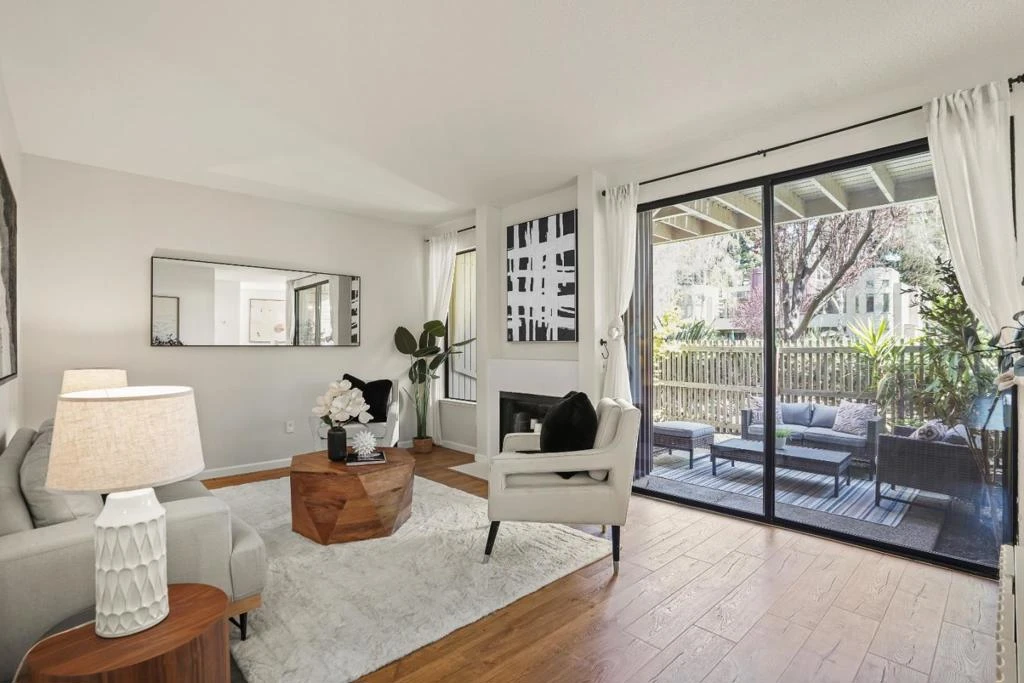 Beautifully remodeled single-level ground-floor corner unit in desirable "The Lakes" complex, only blocks away from Mountain View downtown. With 3 bedrooms & 2 full bathrooms, this 1414 sq ft home features a great floor plan, including a large living room with a cozy fireplace & glass doors leading to a relaxing patio overlooking a lush grass area. Remodeled sunlit kitchen with recessed lighting, breakfast bar, ample cabinets, & garden window. Oversized dining room with dramatic bay windows & lush view is perfect for entertaining. A stunning primary suite with spacious renovated bathroom, stall shower featuring custom tile surround & glass enclosure; built-in cabinets, double closets, & private patio; plus 2 spacious additional bedrooms & a large hall bathroom. Inside laundry with side-by-side washer & dryer plus storage. Large garage with automatic door opener & storage shelving plus additional parking. House has smart thermostats & is wired for both cable internet & fiber. Interior is newly painted, with new wood-laminate flooring & newer window shades. Enjoy the community swimming pool, spa, & private lake. Steps to Jackson Park. Great location has the easiest commute to Google, Meta, Apple, & LinkedIn. Award-winning Mountain View schools. Outstanding opportunity! a must see!