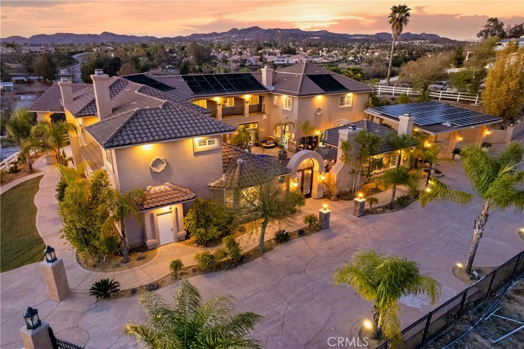 Seller entertaining offers from 1,999,999 - 2,295,000. LOCATION, LOCATION, LOCATION! Are you looking for a La Cresta feel without the drive? This exceptional custom designed and quality constructed residence is situated on 2.5 acres in the heart of Murrieta. Along with the amazing views and close proximity to the 215 & 15 freeways, this home offers a spacious 6283 sqft of living space, with 5 bedrooms and 4.5 bathrooms, including a primary suite on the main floor for added convenience. This meticulously maintained home offers a perfect blend of luxury and comfort, ideal for families seeking a serene lifestyle with modern conveniences. The open-concept design features high ceilings and an abundance of natural light, enhancing the spacious living areas. The gourmet kitchen is complete with granite countertops, custom cabinets, and top-of-the-line appliances, perfect for entertaining family and friends. Unwind in the resort-style courtyard, where you'll find a sparkling swimming pool, built in barbecue, enclosed cabana with hot tub, fireplace and bar, surrounded by a beautifully landscaped outdoor entertainment area. The game room and theater room which includes a 120-inch screen and 4K projector provide endless opportunities for fun and relaxation. Retreat to the luxurious master suite, featuring a lavish master bath and two walk-in closets. Each of the additional bedrooms offers ample space and comfort, making this home perfect for both family living and guest accommodations. This property is not only beautiful but also sustainable with OWNED SOLAR and private WELL for efficient utility use. The attached multi-car garage provides plenty of room for vehicles and storage. The property also includes a large carport, completely fenced with automatic entry gate and multiple balconies. The property is large enough to add ADUs, RV Garages etc... Located in a safe, friendly neighborhood and walking distance to top-rated schools, this property offers easy access to shopping, freeways, healthcare facilities, and nearby parks and recreation. Don't miss out on this rare opportunity to own a piece of paradise in Murrieta. 24925 Franklin St is move-in ready and waiting for you to make it your own. Don’t miss the opportunity to experience the lifestyle you’ve always dreamed of!