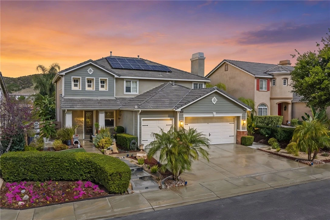 Welcome to Paper Bark Ave., a beautifully appointed, extensively upgraded residence set on a SINGLE-LOADED street w/in the prestigious GUARD-GATED community of Greer Ranch. Showcasing a significant investment in quality enhancements & ENERGY-EFFICIENT systems, this home offers an exceptional blend of refined living, privacy, & modern comfort. Striking curb appeal sets the stage w/manicured landscaping, vibrant accents, & illuminated entry steps leading to a stunning glass leaded front door. Inside, soaring ceilings & luxury vinyl plank flooring create an elegant yet inviting ambiance. Formal living & dining spaces are filled w/natural light, w/the dining rm featuring a custom door for seamless indoor-outdoor flow. The fully REMODELED KITCHEN is the heart of the home, designed w/white cabinetry, an expansive island, quartz counters, tile backsplash, & SS appl., all opening to the inviting family rm w/fireplace, custom built-ins, & ceiling fan. The main level also features a flexible rm w/double door entry, ideal as a 5th BR or office, along w/a nearby full BA. Upstairs, 3 secondary BR offer mirrored wardrobes & ceiling fans, along w/a full secondary BA, + a laundry rm w/sink & storage. The primary suite is a true retreat, capturing scenic views through large picturesque windows w/plantation shutters. The primary BA features a soaking tub, walk-in shower, dual vanities, & a spacious walk-in closet. Designed for efficiency & comfort, the home incl. OWNED SOLAR to SAVE you $$$, newer dual high-efficiency A/C systems (approx. $68K), upgraded insulation & ducting, + a whole house water filtration system. Additional enhancements include crown molding, upgraded baseboards, a security camera system, & a custom generator setup. Step outside to your private backyard oasis, where a covered patio offers the perfect place to relax or entertain year-round. Just beyond, a beautifully designed freeform POOL takes center stage, complemented by a RAISED SPA wrapped in stacked stone & a tranquil spillway cascading into the pool. Surrounded by lush palms, mature landscaping, & a curved stone retaining wall, the space offers both privacy & a peaceful hillside backdrop. Multiple seating areas & an expansive patio make this yard ideal for relaxing or entertaining. Residents of Greer Ranch enjoy guard-gated security, parks, community events, hiking trails & a prime location near top-rated schools, shopping, dining, Temecula wineries, & Old Town Murrieta.