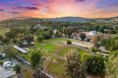 Stunning one of a kind equestrians dream “ view” estate. just over an hour to Orange County and North San Diego. Enter through impressive gated entry up long private driveway. The estate is set up for the professional trainer or personal equine client . Two arenas, one GGT footing, the 2nd arena sand. Round pen, 8 turn outs, 6 with natural oak tree shade, waterers, some grass, white vinyl fencing. Centre Aisle 6 stall barn,auto waterers, fly system, cameras, rubber matting, lookouts, additional 3 stalls, grooming/bathing area. Tack shed and more. The estate has its own shaded riding trail and also access to many miles of riding trails within the area. Small Cabernet Sauvignon vineyard, corn hole and Bocci Ball court ,adjoining gazebo viewing area. Multiple sitting, viewing areas. Expansive Chicken “house”, Italian garden, Zen/prayer area. Many established oaks drape the property with shade and beauty. Three apartment/studios in the barn, parking for multiple vehicles, two automatic security gates.Shade trees, fruit trees and several entryways. Basically Single Story sprawling residence is recently updated with amazing gourmet kitchen with huge center island,2 dishwashers. gas stove, double ovens built in refrigerator and large pantry, opens to grand great room with seoaring ceilings, hand crafted beams, and crackling fireplace, French doors, views from every window. Primary bedroom, 2 walk in closets, fireplace, soaring ceilings and sitting area. Primary bath is stunning , 2 auto toilets, fireplace, romantic tub, grand shower area. Formal dining area has a wall of cabinets and storage with French doors to large patios, formal living area could be a game room or huge office with a wall of bookcases and storage, a bar area and more. Unique Théâtre room has professional seating for 7/8 people. Spacious Secondary bedrooms One with en suite bath and access to the idyllic Koi pond and fountain area. Just one upper viewing room/office/library. Stunning entertainment area with expansive deck, fire pit, fire lights, sparkling spa, infinity pool has waterfall, swim up bar. State of the art outdoor kitchen with t.v. large counters, sit up bars, heater and stainless appliances., BBQ, refrigeration drawers, hot plates/storage area. Outdoor shower, Well ,Koi pond, second fire pit. Spacious three car garage, epoxy,flooring, huge attached storage room, large motor court, drive through road to barn. Several access roads, gates throughout property.