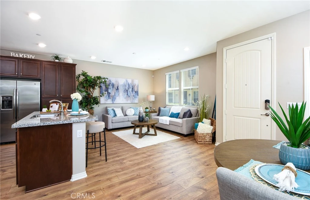 Welcome to Arroyo Vista, a resort style community in the heart of Murrieta! This is one of the most sought-after floor plans in the community. With over 1500 sq ft of luxury living space this home features 3 bedrooms 2.5 bathrooms, a HUGE loft and a 2 car attached garage. This beautiful home is an end unit located in a quiet part of the community and has an extra-large front patio that only a couple of homes have! Its a great place to BBQ and entertain friends and family! This home features luxury designer vinyl wood plank floors throughout the first floor, it carries up the staircase and into the spacious loft area upstairs. Upgraded carpet in the bedrooms. Large laundry room on the second floor for convenience. The gourmet kitchen features granite counter tops with an eat at island, SS appliance package and gorgeous espresso cabinets. Only one common wall makes this home feel like a single-family home! The community is like living at a resort with the sparkling pool and spa, tot lots and BBQ areas. See why so many people are flocking to this community.