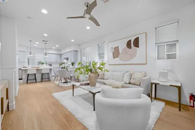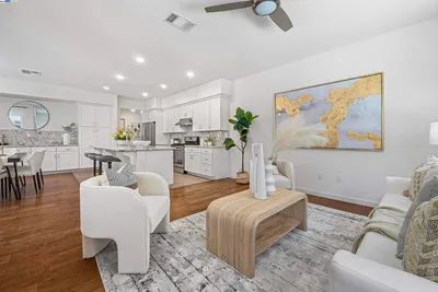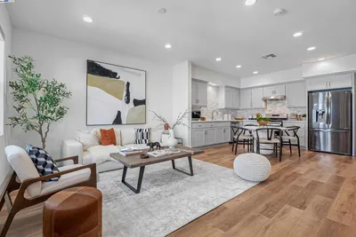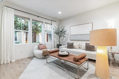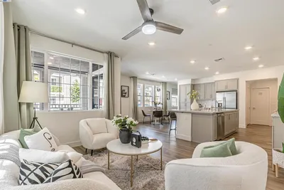 Located in Newarks Bridgeway Community, this four-year new, 2,109 sq ft, four-bedroom, three and a half bath townhome-style condo is thoughtfully designed and exudes elegance. Built by nationally renowned builder, Lennar, this property features a smart, three-story layout including a flexible first-floor bedroom with full bath and walk-in closet. The middle level presents a modern open layout, seamlessly connecting the sun-filled, gourmet kitchen, dining, and living rooms. Additional features on this level include a newly remodeled half bath plus a full-size walk-in pantry. Upstairs, discover three additional bedrooms, highlighted by a luxurious owner's suite, two full baths and laundry closet complete with full size washer/dryer. Residents benefit from a two-car attached garage and exclusive community amenities such as a clubhouse, swimming pool, spa, playground, and dog park. Additional features include luxury vinyl plank flooring throughout excluding stairs, seller owned solar panels, upgraded tile flooring in primary bath, electric fireplace and custom mantle and EV charger outlet in garage. The location provides easy freeway access to I-84/I-880, major employers including Google, Meta, Tesla, and Stanford, plus local shopping, diverse dining options, and nearby trails/parks.