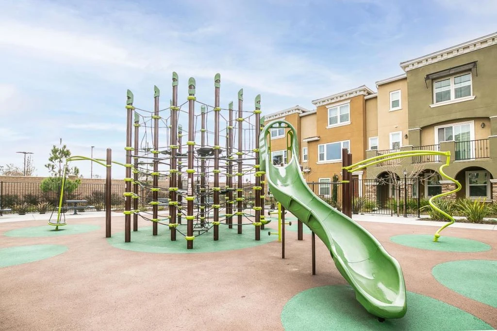 Stunning Corner North East facing Mediterranean style townhome that brings ample sunlight in the morning and evening from all 3 sides of the home (end unit). The home is located in a gated community and upgraded with one of a kind contemporary kitchen with top end luxury finishes encompassing subzero wolf and Italian cabinets. Custom soft close cabinets throughout with storage on both sides of the waterfall island. Living room has custom high end electric fireplace and built in TV unit with motorized solar shades. Custom drapery for all the rooms including living area. Powder room is upgraded with contemporary finishes. Hardwood floors in the living and entry with luxury padded carpet through the bedrooms. Master bedroom has custom built walk-in closet and garage is furnished with Custom cabinet storage unit. The house faces huge community park area allowing significant space in the main entry way making the home stand out. Secured with an access gate allows 2 min walkable access to BJs, AMC, and Costco and new community in the revamping NewPark Mall. Just a turn away to access freeway 880 and walkable distance to Google bus stop, Starbucks, Supermarkets, restaurants and many retail stores. Don't miss to tour this exclusive home in the most sought