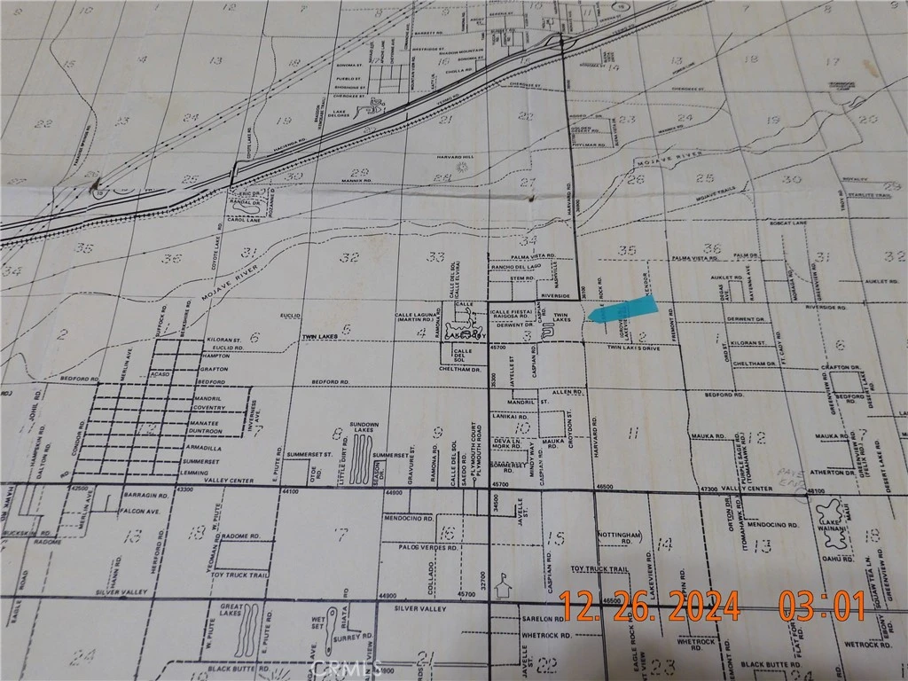 Nice 10.32 acre parcel located on Harvard Rd in Newberry Springs. The property is on the NW corner of Harvard Rd & Derwent Rd. Dimensions of the lot are approximately 340 feet' on Harvard Rd by 1320 feet on Derwent Rd. Electric power lines run down the west side of the property. Buyer would need to check with the Electric Company to verify availability. Homes in the area require their own well and septic system. Directions: From Barstow, head east on I-15 to the Harvard Rd Exit in Newberry Springs. Turn right on Harvard Rd. At approx 3.5 miles, the pavement will end but continue on the dirt part of Harvard Rd for 1/4 mile you will be at Derwent Rd which is the south line of the Subject property.