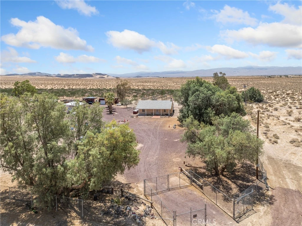 This is one of a kind gem in the desert. This property is a Certified Pistachio Ranch, with over 2000 mature, active pistachio trees. Set on 40 acres of land, 20 of which are fully enclosed for the pistachio trees and living quarters, with chain link fencing topped by barbed wire. The home on the property is custom built, with durable 2x6 construction, a tile roof, and enhanced insulation. The home features two bedrooms and 1 and 3/4 bathrooms across 1,128 square feet of living space. There is a large dry lake that can be reactivated at any time, surrounded by several beautiful Mexican fan palm trees. There's plenty of room for all your toys with multiple outbuildings, RV hookups, a large conex suitable for a workshop, a separate tool shed, and a carport. There is also a well-maintained, already established travel trailer living space, with its own fenced yard and full utilities, for ranch-hands and guests. There are two wells on the property —one is 325 feet deep and the other is 500 feet deep, that provide ample water. There are also two septic systems on the property, one for the home and one for the travel trailer. The home has central heating and cooling, plus an indoor pellet stove for all year round temperature comfort. Located just a short way from the popular EddieWorld, and a half hour drive to Barstow for all shopping needs. This property offers agricultural tax advantages as well as a turn-key, beautiful living space. Far enough out to provide isolation when desired, yet close enough for outings when needed. What you see in the photos is the 20 acres that are fenced in; there are still 20 additional acres to the south of the property that are all part of the sale.