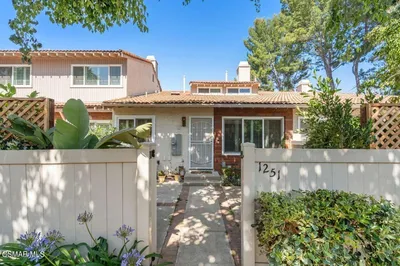 Located in the desirable Marlborough Hills community of Newbury Park, this end unit tri-level townhome offers 2 bedrooms, a versatile loft, 1.5 bathrooms, and 1,012 sq. ft. of comfortable living space. Thoughtfully designed with an enclosed vinyl fenced courtyard/patio entrance featuring wood-like vinyl decking, turf grass, a small paver patio, and vinyl fencing--ideal for relaxing or entertaining. The lower level welcomes you with vaulted ceilings, recessed lighting, and wood-like flooring in the living room, accented by a tile and brick gas fireplace. The adjacent kitchen showcases quartz counters, a decorative tile backsplash, modern lighting above the dining area, and quality appliances including a Samsung oven/stove combo, Samsung microwave, Whirlpool side-by-side refrigerator, and Maytag dishwasher. A small slider opens to the front patio, adding natural light and outdoor connection. Upstairs, the first bedroom (which could be the primary bedroom) features vaulted ceilings, a large window, and a walk-in closet. The second bedroom includes a Murphy bed, mirrored closet doors, and another vaulted ceiling. The full bathroom services both bedrooms and offers a quartz countertop, modern tile shower with etched glass door, pebble stone flooring, bench seat, and a glass tile shampoo niche. The loft overlooks the living room and serves perfectly as a home office or flex space. Additional features include dual-pane windows, modern cabinet finishes, an attached two-car garage with laundry hookups (washer and dryer included), and built-in storage racks. Residents of Marlborough Hills enjoy access to community amenities such as a pool, spa, clubhouse, tot lot, tennis and basketball courts, and scenic greenbelt areas. Conveniently located near hiking and biking trails, shopping, dining, and top-rated Conejo Valley schools, this home blends comfort, function, and lifestyle.
