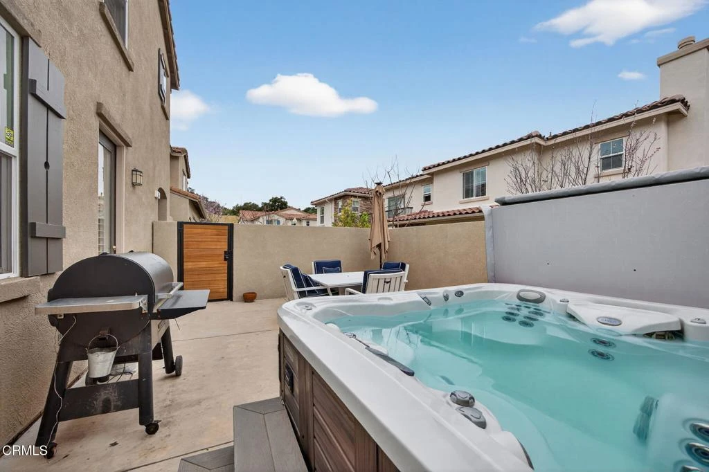 Welcome to this beautifully upgraded 3-bedroom, 2.5-bath townhome offering 1,734 square feet of comfortable living in the highly desirable Oak Terrace Community of Newbury Park. This end unit, built in 2016 has been proudly maintained by the original owners, this home combines modern upgrades with comfort and style.Step inside to find rich hardwood flooring, upgraded cabinetry throughout, and an open-concept layout the connects the living, dining and kitchen areas, complemented by custom shutters, and ceiling fans that enhance the comfort and elegance. The spacious living room features a cozy fireplace and flows seamlessly into the open kitchen, creating the perfect layout for both everyday living and entertaining. Upstairs you will find three bedrooms, including the large primary suite with walk in closet and the convent laundry room with lots of extra cabinetry.Comfort is elevated with dual-zoned air conditioning and added insulation between the first and second floors, helping maintain a quiet and energy efficient environment year round.The attached two car garage features epoxy-coated flooring, a new garage door and additional overhead storage, providing both durability and excellent storage solutions.Outdoor living is just as inviting. Enjoy the private patio area featuring a new gate and relaxing spa perfect for unwinding at the end of the day.Additional highlights include mountain views, fiber optic connectivity for high speed internet and modern living. This exceptional home offers the perfect blend of comfort, upgrades, and location in one of Newbury Park's most sought-after communities!