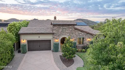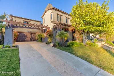 Gorgeous Light & BRIGHT Dos Vientos Pool Home in Villa Serrano! Set on an expansive ~1/4 acre lot, this beautifully upgraded residence showcases STELLAR curb appeal with its modern-Tuscan architecture, LUSH grass lawns, tropical landscaping with swaying palm trees, manicured grounds, and a welcoming front porch that sets the tone for the GRAND interior. Step inside to a SPACIOUS open floorplan highlighted by TALL ceilings and an ABUNDANCE of natural light, complemented by high-quality wood flooring flowing throughout. The Living Room is filled with sunlight from TALL windows with plantation shutters, while the adjacent Office--complete with mullioned French doors, built-ins, and sidelights--offers flexibility as a potential 5th bedroom, giving the option for TWO bedrooms downstairs. The Formal Dining Room is ideally positioned between the Living Room and Kitchen, providing an elegant space for gatherings. The Family Room is SUPER BRIGHT and generously sized, featuring built-in ceiling speakers and a CHIC resurfaced gas fireplace with bench-style hearth, all overlooking the beautifully designed backyard. The GOURMET Kitchen is a chef's DELIGHT, showcasing soft-close shaker cabinetry, mosaic tile backsplashes, granite countertops, and a LARGE redone center island with breakfast bar seating, 5-burner gas cooktop, and mosaic-tile surface. High-end stainless-steel appliances include a Thermador convection double oven, and the adjoining breakfast area enjoys backyard views with direct access outside. A downstairs bedroom with WALK-IN closet and direct access to a full bath provides ideal guest or multi-generational living. The Laundry Room offers TONS of storage, tile countertops, wash basin, and direct access to the finished 3-car garage (including tandem bay) featuring EPOXY flooring, ceiling storage racks, and EV charger readiness. Upstairs, the Primary Suite (~800 sq ft) is a PRIVATE retreat with double-door entry, separate sitting area, BRAND-NEW plush carpet, and an en-suite bath which has been beautifully redone with NEW tile flooring, dual vanities + private makeup station, a grand soaking tub, STUNNING frameless glass shower with bench, and TWO closets including a large custom-organized walk-in. An additional room off the bath offers ideal use as a nursery, gym, or second walk-in closet! Secondary bedrooms are WELL-SIZED, each with ample storage, and two feature en-suite bathrooms. A HUGE upstairs Bonus Room offers incredible flexibility for a media room, playroom, gym, office, or additional bedroom--with easy potential for Jack & Jill bath access. The backyard--fully REVAMPED in ~2020--is an entertainer's PARADISE featuring a pebble-surfaced geometric pool & spa, stone decking, wood-like patio flooring, sprawling artificial grass lawns, a STUNNING stacked-stone outdoor fireplace, and a granite-topped built-in BBQ with Delta Heat grill and gas line. A wide side yard with mature avocado tree adds even more usable outdoor space. Additional highlights include DUAL HVAC with NEWER A/C units (2021), NEWER water heater (2021), newer pool pebble finish, and BRAND-NEW carpet. Located within WALKABILITY to Sycamore Canyon School (K-8) + Del Prado Playfield and nestled in the pristine & highly desirable Dos Vientos community with access to TOP-rated schools, scenic parks, and miles of hiking and biking trails--this is an exceptional opportunity to enjoy one of the Ventura County's most sought-after neighborhoods.