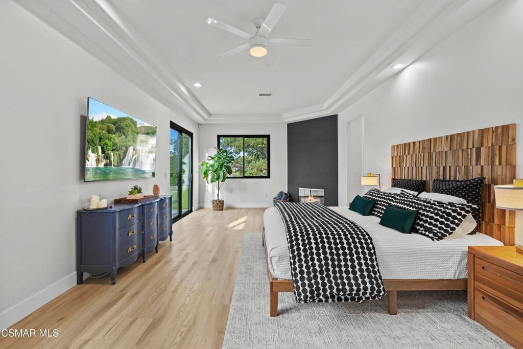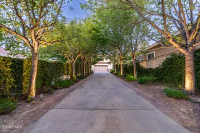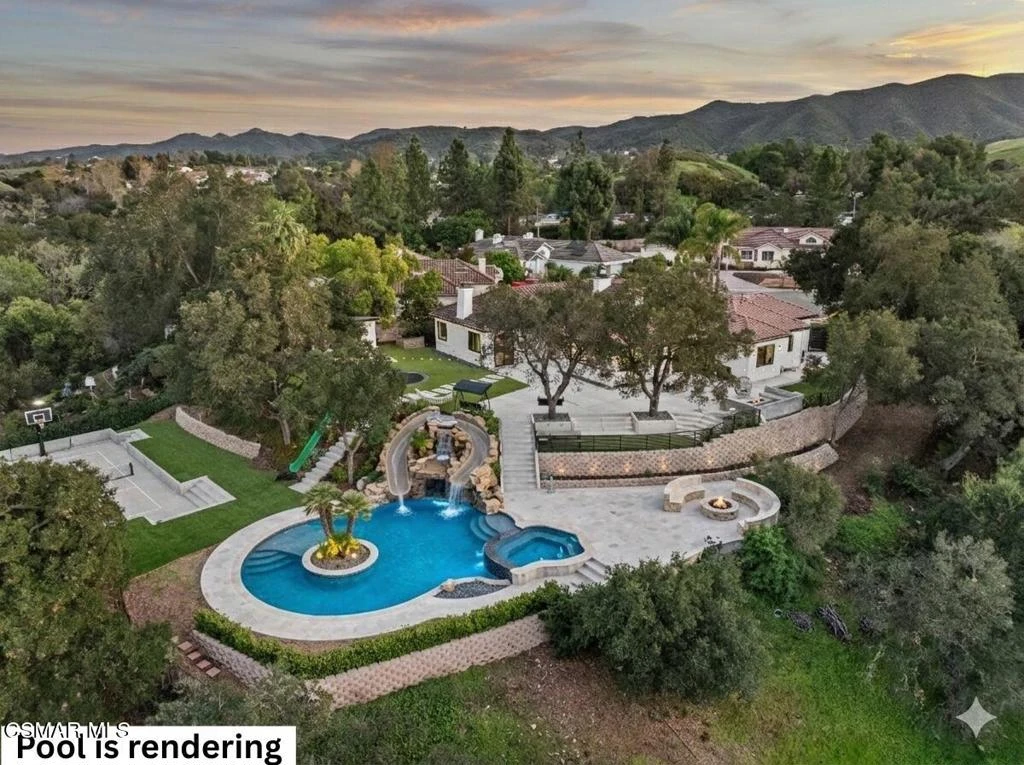 VIEWS! PRIVACY! CONVENIENCE! Privately set at the end of a quiet cul-de-sac in the heart of Thousand Oaks, this fully reimagined single-story estate spans over 4,000 square feet on an extraordinary one-acre lot with unobstructed panoramic mountain views. Surrounded by protected open space and just minutes from the 101 and The Oaks Mall, the home offers a rare blend of serenity, accessibility, and resort-style living.A long, private approach opens to expansive grounds designed for both elevated entertaining and everyday enjoyment. The property unfolds like a private compound, with sweeping vistas, mature landscaping, and direct access to the trails of Rancho Conejo Nature Preserve. The largely flat, usable acreage includes over 9,000 square feet of additional open land and is zoned for horses, offering flexibility for future customization. The plumbing, electrical, and gas lines are already in place for a potential resort-caliber pool.The outdoor experience is unmatched. A lighted pickleball court anchors the grounds, while a custom treehouse complete with rope swing and cargo net, a dramatic 30-foot hillside slide, two fire pits, and multiple gathering spaces create a setting that feels both playful and refined. Over 6,000 square feet of maintenance-free artificial turf blend seamlessly with more than a dozen mature oak and palm trees. Smart home-enabled lighting and water features elevate the landscape into a true evening showpiece. A detached office provides a quiet, separate workspace tucked away from the main residence.Inside, soaring 10-foot ceilings, oversized windows, and walls of glass flood the interiors with natural light and frame the surrounding mountains. The open floor plan is thoughtfully designed for effortless indoor-outdoor flow, creating a bright and expansive atmosphere throughout. Two distinct living areas offer flexibility for both formal and casual gatherings, each anchored by its own fireplace.The chef's kitchen serves as the centerpiece of the home, showcasing an oversized natural stone island, large picture windows overlooking the backyard and preserve, and a generous walk-in pantry complete with a secondary refrigerator and prep sink. The design balances scale with warmth, making it equally suited for intimate dinners or large-scale entertaining.The primary suite is a private retreat, featuring its own fireplace, direct patio access, and a spa-inspired en suite bath with a freestanding soaking tub, dual shower heads, a spacious walk-in closet, and a floating double-sink vanity. Additional features include dual air conditioning systems, automated blinds, and a recently installed tankless water heater.This is a rare offering that captures the very best of Thousand Oaks living--panoramic views, total privacy, usable acreage, and a thoughtfully remodeled single-story residence designed for seamless indoor-outdoor luxury.