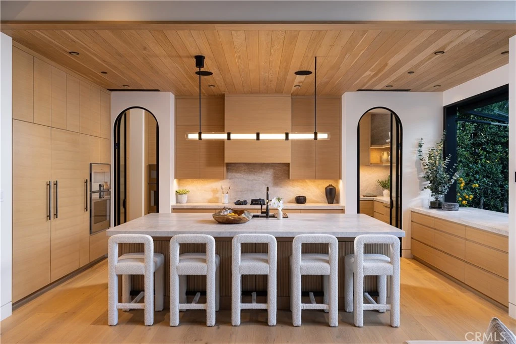 Situated within Newport Beach’s coveted Golden Corridor, Cabo Del Sol is a newly constructed coastal residence inspired by The Four Seasons in Cabo San Lucas. Designed by award-winning architect Eric Aust, built by Burkhart Brothers Construction, with interiors by Sérendipité Interior Design and landscaping by Garden Studio. Located in the heart of Dover Shores it offers a refined blend of Baja California-inspired warmth and modern Mediterranean sophistication. A dramatic double-height entry welcomes you through a custom oak archway, framed by mature 16-foot privacy hedges that create a serene and private arrival. The expansive great room is highlighted by soaring 14’6” ceilings and custom 12-foot Fleetwood doors that create a seamless indoor-outdoor living experience. At the center of the home is a chef’s kitchen featuring a Pitt cooktop, premium Gaggenau appliances, fluted wood island detailing, Taj Mahal leather quartzite countertops, and custom oak cabinetry. A disappearing pass-through window opens directly to the outdoor dining area, while a concealed secondary catering kitchen hidden behind fluted glass and steel archways adds exceptional functionality for entertaining. The exterior architecture is equally compelling, showcasing distinctive dormer accents, expansive windows, a living roof element, and thoughtfully curated landscaping that complements the coastal streetscape. Offering approximately 4,857 square feet of living space, the home features five ensuite bedrooms, five full baths, three half powder baths, a private office, and a separate loft. Interior finishes include wide-plank white oak flooring, vaulted ceilings, limestone and quartzite accents, and a timeless neutral palette. A first-floor guest suite offers flexibility, while the upper level hosts additional bedrooms and a luxurious primary suite with a spa-inspired bath, soaking tub, steam shower, floating vanities, and an oversized 300 sqft walk-in closet. Additional highlights include custom lighting, natural stone finishes, a three-car garage with dual access to the mudroom and secondary kitchen, and an upstairs laundry room. The resort-style backyard wraps around the home and features a custom pool and spa, California room, outdoor kitchen, fireplace, fire pit, integrated audio, and outdoor bath with covered lounge areas. Cabo Del Sol offers elevated coastal living near Fashion Island, John Wayne Airport, 17th Street Costa Mesa dining, and the iconic Newport Beach lifestyle.