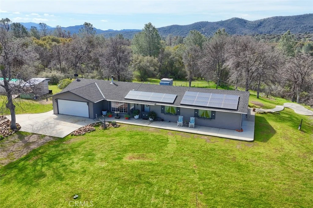 Find yourself lost in the jaw dropping views from every angle! Over 35 acres, much of which is meticulously manicured and graced with beautiful mature oak trees. A large portion of the property is fenced with chainlink. This 2x6 construction western home has been well maintained and showcases pristine updates. Step through the front door to find your open concept living room with breathtaking views of the snowcapped Sierra Nevada mountain range. Stay snug as a bug in the wintertime with a free standing wood stove. In the kitchen, you'll be awestruck by the quartz countertops, recessed lighting, breakfast bar and farmhouse sink. Next to the kitchen and living room is a designated dining area with extra space for a piano, office area, gaming area or whatever your heart desires. This home has two guest bedrooms and a primary bedroom. The primary bedroom has space for all of your spiffy duds with 2 walk in closets. The ensuite off the master bedroom contains his and hers sinks and a walk-in shower. Don't feel like hanging out in the bedroom? Step outside of your sliding glass door to find your private screened in porch, which is not permanently attached to the home so it can be moved wherever you wish! To the back of the home there is a cement walkway that leads to a lower patio area, perfect for summertime BBQ's or simply watching the incredible sunsets. Whether you're a gardener, carpenter or motocross rider, this property is sure to impress. Everything you need to enjoy your hobby is here with an attached 2 car garage, a 28x10 greenhouse, multiple sheds and covered workspaces. A leased 32 panel solar system, provides enough power for the whole house, saving you money each month. There is an RV pad out front if you need extra space for guests. Come see this showstopper today and make the move to your private paradise!