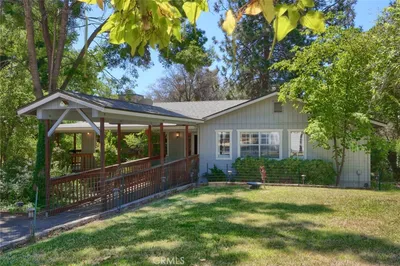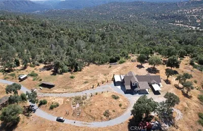 Stunning 4 bedroom, 2 1/2 bathroom home situated in a private setting on 4.46 acres of useable land. This home is move in ready and looking for it's new owner. Enter to find the gorgeous open concept living area with laminate floors throughout. The skylights in the living room make this space feel bright and warm. The showpiece here though has to be the jaw dropping rock fireplace designed and built by Hansel Kern. The kitchen comes equipped with a breakfast bar, granite countertops, a gas range, a double sink and a large walk in pantry for plenty of food storage. With over 2,400 square feet of living space and large wrap around covered porch, there is ample room here for entertaining guests! The master bedroom has vaulted ceilings, a sliding glass door leading to the porch and an ensuite bathroom with a walk-in shower, his and hers sinks and a jetted tub. The home is a steel frame constructed home with Trex decking and vinyl deck handrails, adding fire resistance. Need space to store vehicles, yard equipment or your toys? Here you will find 2 carports (one of the carports is specifically for a Class A RV and at least 12FT tall), an attached garage, a 24x12 barn with a roll up door and a 24x27 shop with a half bathroom. Enjoy being 40 minutes to Fresno, 10 minutes to Bass Lake boat launch and 30 mins to the entrance into Yosemite! The home has it's own well also and is not tied to the community water system. NO HOA