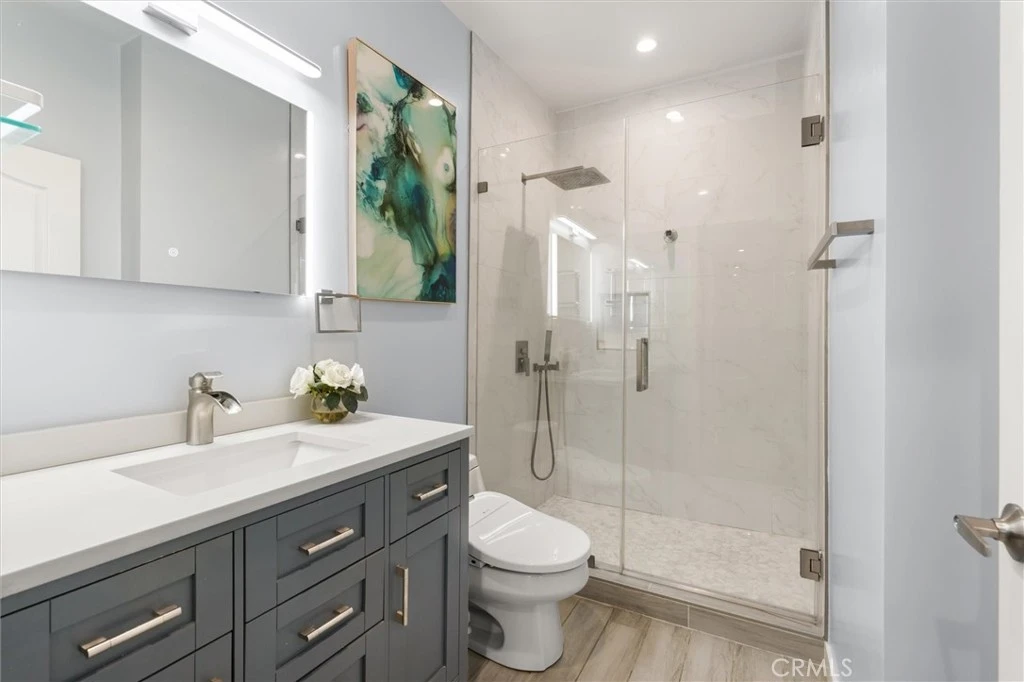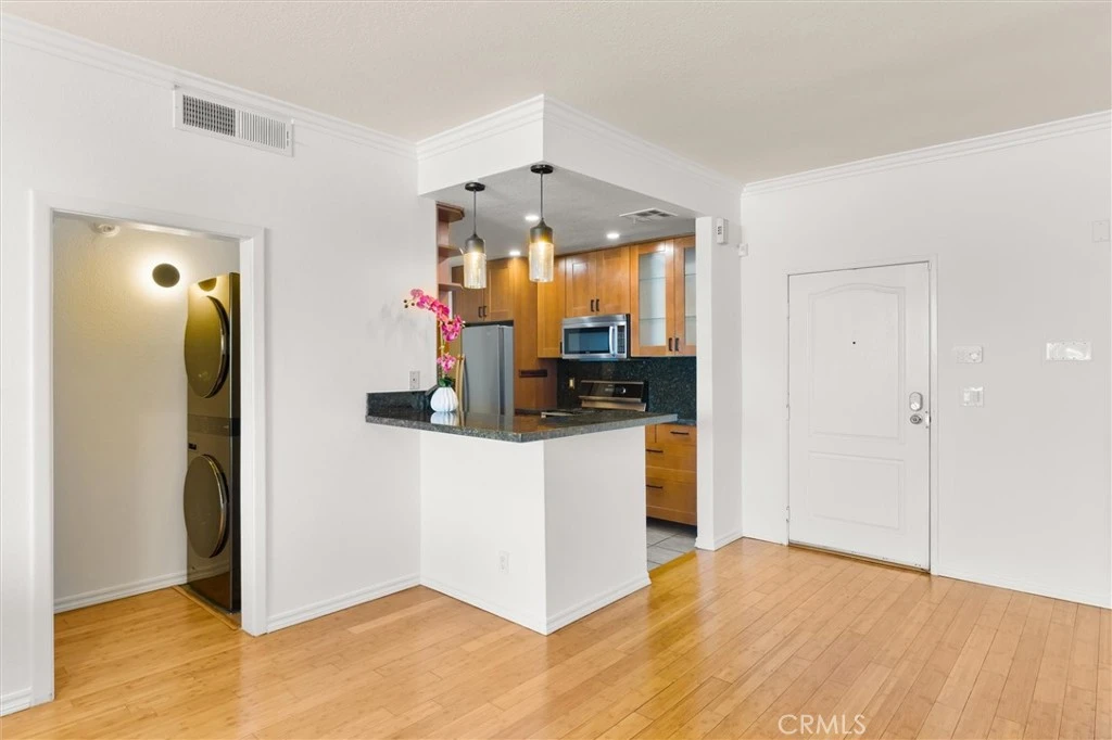 Experience the ultimate urban retreat in the heart of the NoHo Arts District! This tech-forward, freshly painted condo is a buyer’s dream, blending modern convenience with a prime walkable location. The "smart" interior features a Nest thermostat, Kasa dimmer switches, and a primary suite boasting a remodeled bath with an electric bidet and an anti-fog Bluetooth speaker mirror. The chef-ready kitchen is anchored by premium Bosch appliances and a brand-new refrigerator, while the laundry area features a sleek 2025 LG Wash Tower. Recent upgrades provide peace of mind, including energy-efficient double-pane windows and an A/C system replaced just 3 years ago. Located on the quiet backside of the building to ensure privacy and zero street noise, you can enjoy your morning coffee on the large, tree-lined private balcony or head to the rooftop deck for panoramic Valley views. Secure living with gated 2-car parking, perimeter security cameras, and extra shared storage. Live steps away from NoHo’s best coffee shops, bars, comedy clubs, and North Hollywood Park. Incredible commuter access to the 101, 134, and 170 freeways, plus proximity to major studios and Universal. Low-maintenance, high-tech, and perfectly situated—welcome home to Peach Grove!
