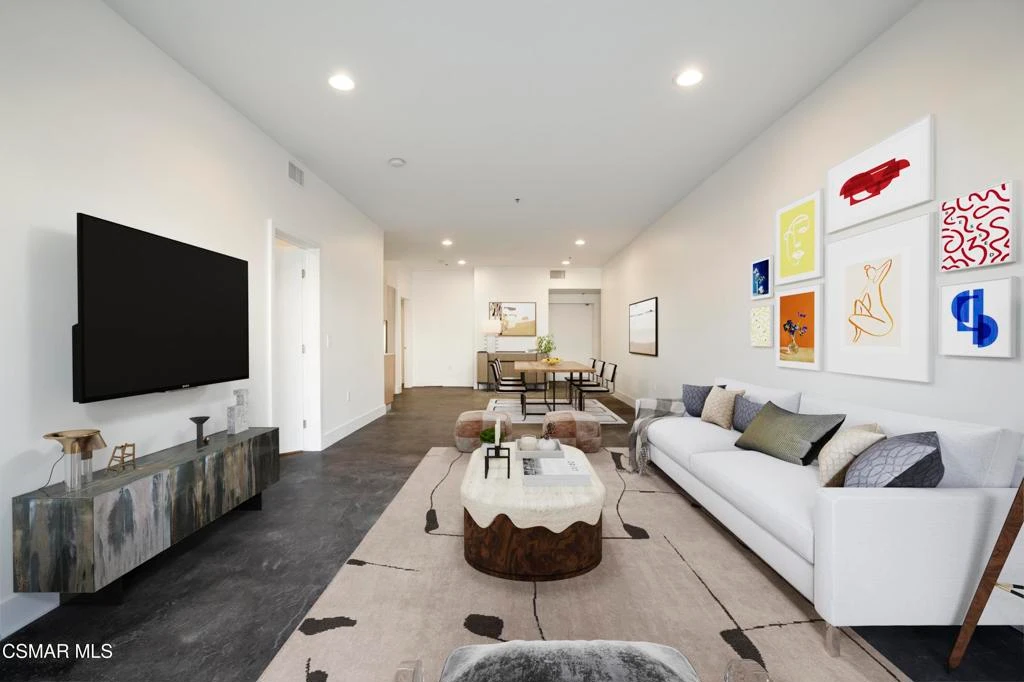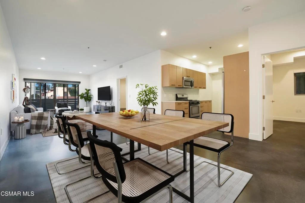 Welcome to 5016 Bakman Ave., 104 - a stylish 2-bedroom, 3-bathroom ground-floor condo offering 1,350 sq ft of refined living space in the heart of North Hollywood. An open-concept layout welcomes you with a light-filled living area, enhanced by updated concrete flooring, recessed lighting and a tasteful modern color palette. A large glass slider extends the living space outdoors to a private patio, creating a seamless indoor-outdoor flow ideal for relaxing or entertaining. The contemporary kitchen is designed with both form and function in mind, featuring stainless steel appliances, an upgraded industrial-style faucet and abundant cabinetry for exceptional storage. A convenient guest bathroom includes full-size stackable laundry hookups for added practicality. Both spacious bedrooms feature their own modern ensuite bathrooms, each appointed with dual vanities for comfort and convenience. Additional highlights include Lutron motorized window shades in the living room and kitchen, secured underground tandem parking and guest parking within the complex. Residents enjoy resort-style community amenities including a fully equipped fitness center with free weights, machines and treadmills. Ideally located near shopping, dining and public transportation - this gem offers exceptional urban convenience with a modern lifestyle appeal. Welcome home.