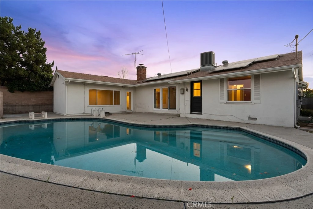 Charming mid-century ranch located on a quiet cul-de-sac in the highly desirable Walnut Cove neighborhood of Northridge. This inviting home offers 3 spacious bedrooms, 2 bathrooms, and approximately 1,845 sq ft of comfortable living space, along with a private backyard featuring a sparkling pool—perfect for enjoying the California lifestyle. A welcoming front porch leads into a bright interior with classic mid-century character and tasteful updates throughout. The updated kitchen features granite countertops, ample cabinetry, a sunny breakfast nook, and a full suite of appliances including a gas range, electric oven, and dishwasher. A separate laundry room with storage and side-yard access adds convenience. The spacious living room includes a cozy fireplace and large sliding glass door that opens to the backyard, creating easy indoor-outdoor living. A separate dining room with shutters and chandelier lighting provides a perfect setting for formal gatherings, while the step-down family room offers additional space for relaxing or entertaining. The primary bedroom features a walk-in closet and en-suite bathroom with stall shower and vanity. Secondary bedrooms are bright and comfortable with generous closet space and hardwood floors beneath the carpeting. A full hallway bath with shower-over-tub serves the additional bedrooms. Enjoy a private east-facing backyard with morning sun and afternoon shade—ideal for outdoor dining, relaxing, or spending time by the pool. Additional highlights include dual-pane windows, central air and heat, mostly copper plumbing, a 200-amp electrical panel, composition roof, owned solar power system, and an updated sewer line. Conveniently located near California State University, Northridge, schools, shopping, dining, and major freeways, this special home offers the perfect blend of vintage charm, modern comfort, and everyday convenience.