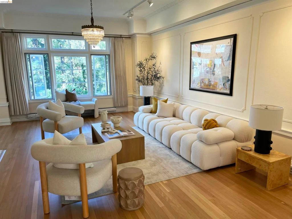 The Regillus is a 1920s Beaux Arts luxury condo building on Lake Merritt. The grand marble lobby leads to formal gardens and terraces with sweeping views of the lake. HOA includes attendant reception desk, insurance, security with closed circuit cameras, internet and cable TV, water/sewer, trash, laundry, building management, maintenance and cleaning staff. Close to Whole Foods, Trader Joe's and a 5-minute walk to BART. This spacious 2-bedroom, 2 bath 1379 sqft condo features 10 ft ceilings and has been renovated preserving ornate detail with four vintage deco crystal chandeliers. A marble foyer leads into the spacious formal living room with grand, wood-burning fireplace. To the left is a formal dining room. The large, renovated custom kitchen has quartz counters, herringbone backsplash, and custom soft-close cabinetry. Bathrooms have been renovated yet still honor the original 1920s period. Updated electrical panel. This elegant condo features refurbished, white oak hardwood floors with original, large multi-paneled windows on three sides of condo letting in lots of light. Custom window coverings include Belgium linen curtains and motorized black out shades. Includes one garage parking space and private storage room.