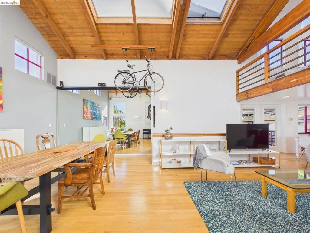 A rare fusion of Italian-inspired design and live/work functionality, this striking 1,636 sqft loft unfolds across three light-drenched floors in centrally located West Oakland. Soaring vaulted ceilings with exposed wood beam trusses set a dramatic stage — the kind of volume that invites creativity, complete with electrical connections in the rafters for studio or shop equipment. The showpiece kitchen dazzles with high-gloss crimson cabinetry, premium stainless appliances, and a chic dining space ideal for entertaining. Upstairs, the loft bedroom suite offers an intimate cathedral retreat with skylights and warm wood finishes. Two contemporary bathrooms feature porcelain tile walls and refined fixtures throughout. The flexible first-floor studio — with its own private entrance, kitchenette, and stacked laundry — functions seamlessly as a guest suite or creative studio. Outside, a lush shared courtyard with mature palms and a fountain creates a serene urban oasis.