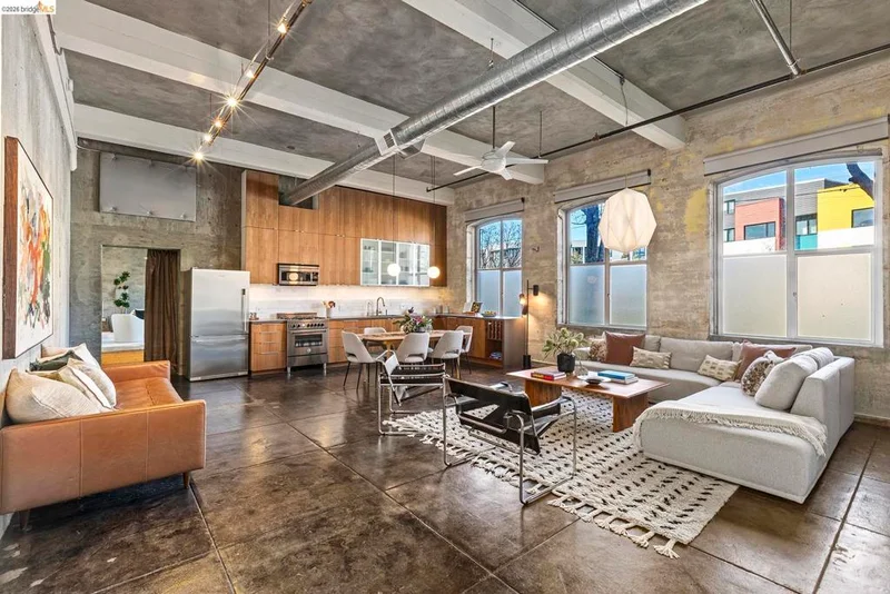 Authentic Artists loft on the Emeryville border in the historic Clawson Elementary School (1917), converted to West Clawson Lofts in 1999. This 1,733 SQ FT level-in residence blends soaring 13' ceilings, exposed concrete, and dramatic aluminum windows that flood the space with natural light. Enter the building and see the beautiful, pressed tin ceilings, walk the halls, and the hall-gallery of residents’ work. Configured as 1 bedroom / 1 bath, the expansive open floor plan offers flexibility for creative live/work use or potential reconfiguration. The current owner utilized the space as a ceramic’s studio; a prior owner, a noted jazz musician, recorded and hosted shows. Features include concrete floors, new plush carpet in gigantic bedroom, modern kitchen with Carrara marble backsplash and walnut cabinetry, spa-like bath with tiled shower over tub, in-unit laundry, whole-home dehumidification, and abundant storage. Rare double-wide exterior doors create seamless guest or client access.Professionally managed building with secure gated parking (1 deeded space), ample visitor parking, and rooftop patios for gardening and entertaining. Near Arizmendi, Soba Ichi, Townhouse, Emeryville retail, 4 blocks to Pixar. Easy access to BART, I-80, I-580, I-880 & CA-24.
