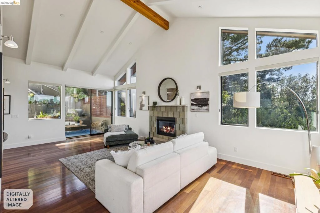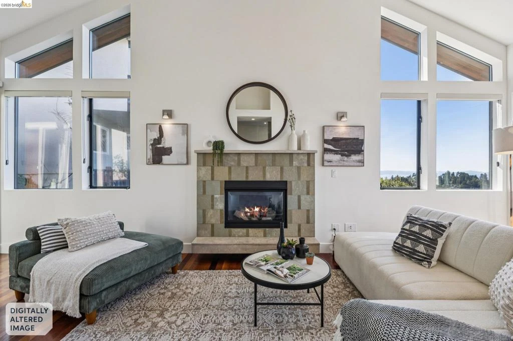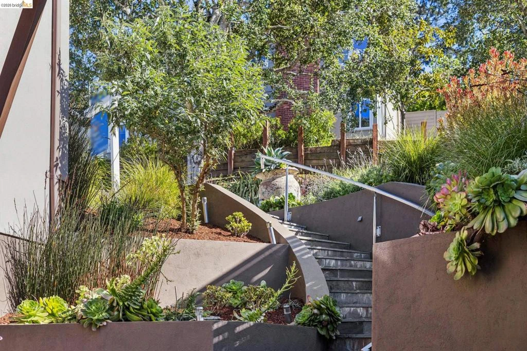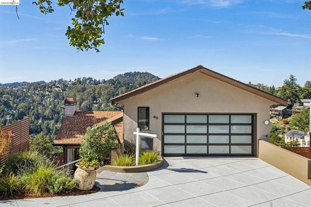 Sophisticated contemporary with sweeping canyon views, tucked at the end of a quiet, private lane in the Oakland Hills. At 46 Carisbrook Lane, privacy, natural light, and a seamless connection to the outdoors define the experience. Three bedrooms are located on the same level, with a separate office upstairs, while the flexible lower level offers space for a guest suite, media room, home office, or in-law setup. Designed for both everyday living and entertaining, the home features a spacious dining area, indoor-outdoor living spaces, and a gourmet kitchen that opens to a light-filled living room with high ceilings and a gas fireplace. Expansive windows frame the surrounding redwoods and canyon views. Enjoy morning coffee on the porch with birdsong, watch hawks soar across the canyon, and take in breathtaking sunsets that fill the home with warmth and color. Just minutes from Montclair Village, highly rated schools, and miles of hiking and biking trails, this home offers a rare balance of tranquility and convenience.