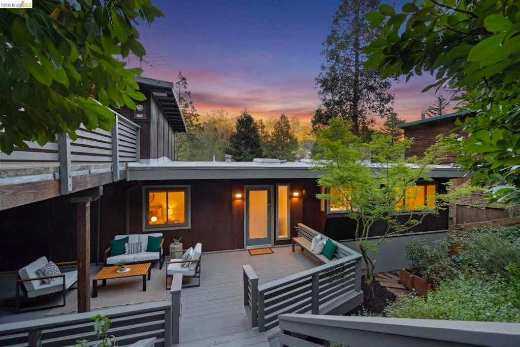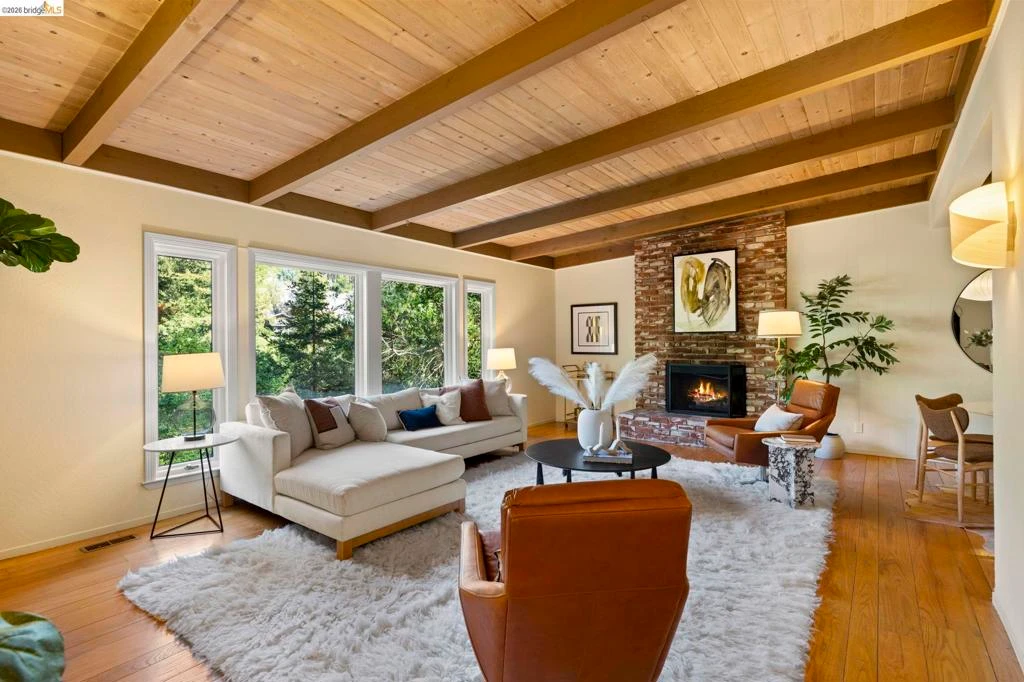 Contemporary Montclair Hills Retreat w/Great Outdoor Spaces. Verdant views, wood beam ceilings & a relaxed mid-century sensibility define this sophisticated residence, offering true indoor outdoor living w/exceptional flow to the surrounding grounds. Beam ceilings & designer lighting carry through dining & living rooms, w/lush greenscape views giving way to a brick wood burning fireplace & forested treetop views. The kitchen features stone countertops, stainless appliances & undermount sink, flowing into the dining room ideal for entertaining. The primary suite includes a wall of closets & updated bath w/aqua subway tile, frameless glass shower & dual vanity w/concrete sinks. Sliding doors open to a private balcony among the treetops. An additional bedroom & hall bath pairing a classic clawfoot tub w/crisp modern finishes complete the main level. The lower level, finished in bamboo flooring throughout, offers two additional bedrooms, full bathroom, laundry & ample storage, plus a generous den w/standalone gas fireplace & sliding doors to lush outdoor spaces. Flowing off the den, a newly renovated deck & level-out rear gardens perfect for play & upcoming spring & summer soirees. Minutes from Montclair Village shops & restaurants w/nearby trail access & Highway 13.
