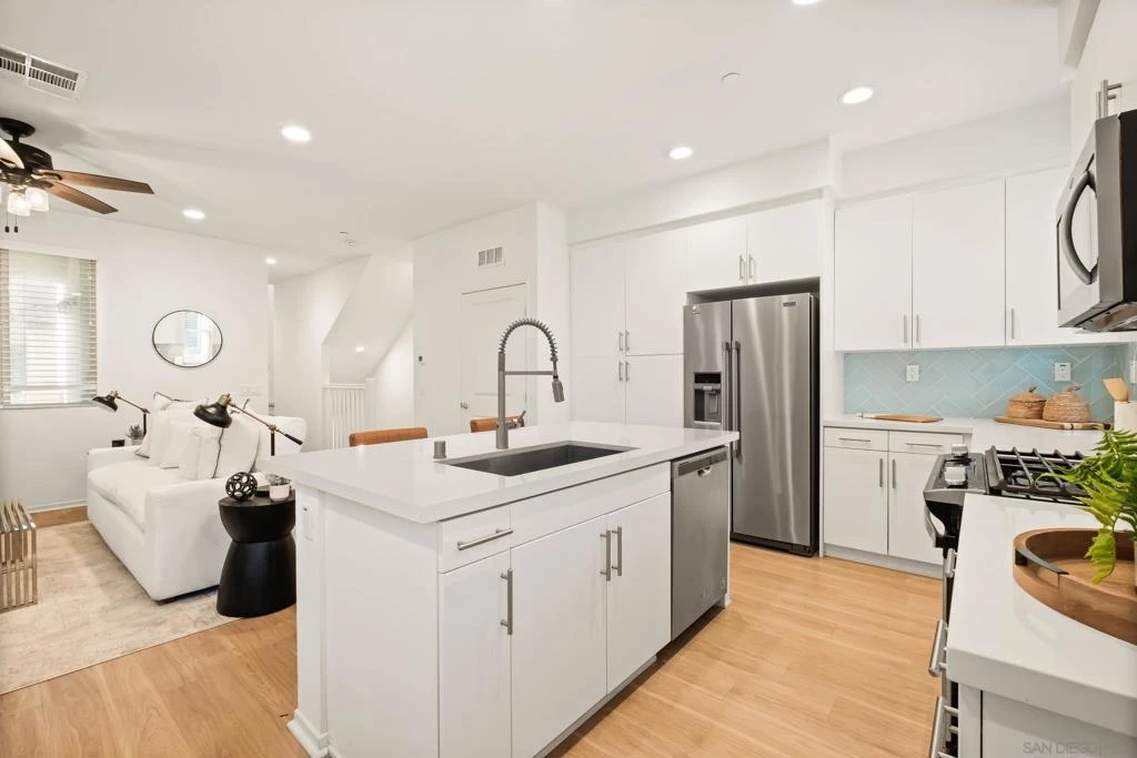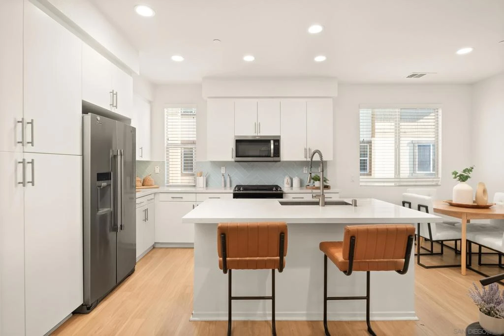 Welcome to this beautifully upgraded 4 bed/ 3.5 bath town home in the coveted gated community of Pacific Ridge in Oceanside! Built in 2017, this modern three-story townhouse combines designer finishes, premium upgrades, and a bright, open layout for the ultimate coastal lifestyle. The entry level features a private bedroom with a full bath, perfect for guests, a home office, or renting the room out. The main living area has an inviting open floor plan with a gourmet kitchen that includes quartz countertops, premium stainless-steel appliances, and abundant cabinetry, flowing seamlessly into the spacious dining and living areas. Upstairs, the primary suite offers a walk-in closet and spa-inspired bath with dual vanities, while two additional bedrooms provide plenty of space for family, guests, or a flex setup. Throughout the home, enjoy premium engineered hardwood floors, custom accent walls, in-ceiling speakers, and a Kinetico whole house water filtration system with reverse osmosis filter. An attached two-car garage and pet-friendly policy add everyday convenience. Residents of Pacific Ridge enjoy resort-style amenities, a sparkling pool, relaxing spa, BBQ areas, parks, and playgrounds. Ideally located just minutes from the beach, shopping, dining, and major freeways. This property is VA approved and is eligible for down payment grants. Reach out for more info.