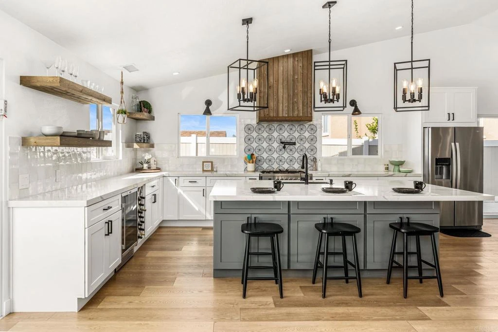 This stunning, fully remodeled single-story home in Oceanside offers 4 bedrooms, 3 bathrooms, and a 2-car garage, tucked away on a quiet cul-de-sac. Designer finishes and premium upgrades shine throughout, while the open floor plan and soaring ceilings create a bright, airy atmosphere. An additional flexible living space provides the perfect option for a dining area, lounge-style seating, or an elegant bar area with a fireplace, ideal for entertaining or relaxing. Multi-panel bi-fold patio doors seamlessly connect indoor and outdoor living, opening to a private backyard oasis with a resort-style pool, spa, covered outdoor BBQ with bar seating, solar, and a variety of mature fruit trees, including avocado, lemon, lime, plum, orange, and apple, along with fresh ginger root, creating a beautiful and productive garden setting. The gourmet BBQ bar seating features a large island, custom cabinetry, top-of-the-line appliances, and a wine refrigerator. The spacious owner's suite offers a luxurious bathroom with a soaking tub and direct access to the resort-style backyard. This exceptional home truly shows like a model—inside and out. Ideally situated between Orange County and San Diego, this home offers the perfect balance of tranquility and convenience with easy access to I-5 and Highways 78 & 76, and is just minutes from Camp Pendleton, local beaches, scenic trails, dining, and shopping.