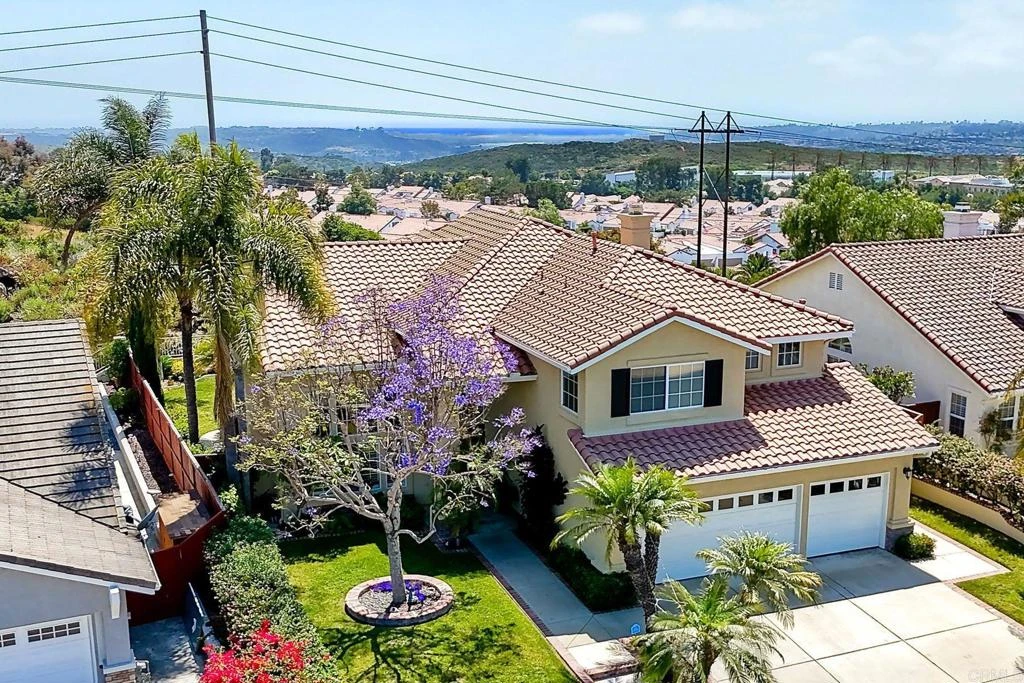 Stunning OCEAN VIEWS and MAIN FLOOR BEDROOM in the sought-after community of Ridgeview in Ocean Hills. The home is bathed in abundant natural light with vaulted ceilings in the foyer and living room. The kitchen has been updated with quartzite and marble countertops, custom cabinets, a built-in wine fridge, stainless steel appliances, and a Jennair gas cooktop. The custom-built family room is another highlight of the house. The first floor features wood floors and carpeting. The house boasts dual-pane windows on the western side, offering a breathtaking view of the ocean and surrounding hills. The primary bedroom and bath are spacious, with sliding doors opening to a deck that offers panoramic views of the ocean and beautiful sunsets. An additional bonus/den room with ocean views is attached to the primary suite. The west-facing backyard is a perfect spot to enjoy the ocean views and sunsets. Additionally, there are miles of hiking trails at Calavera Nature Preserve, conveniently located within walking distance.