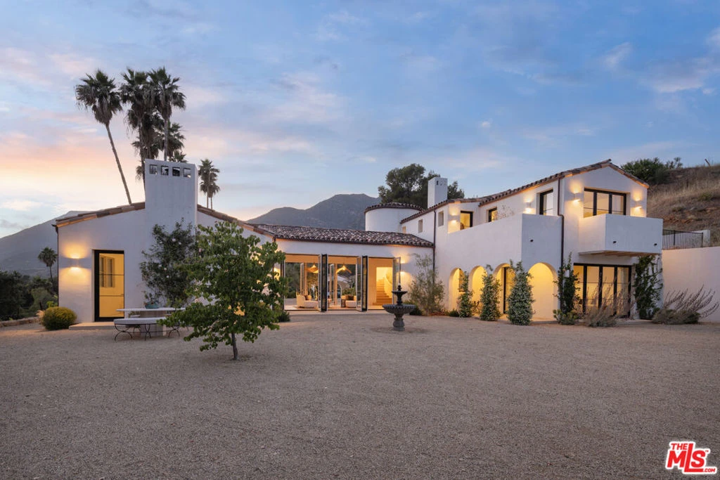 Perched on a private knoll in Ojai's coveted East End, this 2023-built estate blends modern Mediterranean design with refined living. The 5,100 sq ft villa sits on nearly two secluded acres and includes a fully licensed, organically farmed boutique vineyard with over 1,300 mature vines.Thoughtfully crafted with top-tier materials, the home features a dramatic great room with 12-foot ceilings, floor-to-ceiling French doors, groin-vaulted ceilings, and a sculptural circular staircase. White cement floors, hand-plastered walls, and arched passageways add timeless elegance.Designed for both entertaining and everyday luxury, the chef's kitchen boasts Sub-Zero refrigeration, Fisher & Paykel ovens, and Waterworks fixtures, flowing into open dining spaces and a veranda perfect for enjoying Ojai's "Pink Moment" sunsets.Four private bedroom suites, each with spa-style baths and outdoor terraces, provide serene retreats. The grounds offer ancient oaks, an olive allee, drought-tolerant gardens, a heated pool, spa, and multiple outdoor living areas.This estate combines beauty with function. Plans for an ADU, a potential winemaking facility, and safety features like fire-resistant materials, private hydrant, and emergency turnaround ensure long-term peace of mind.A rare blend of design, nature, and opportunitythis East End estate is more than a home; it's a legacy.