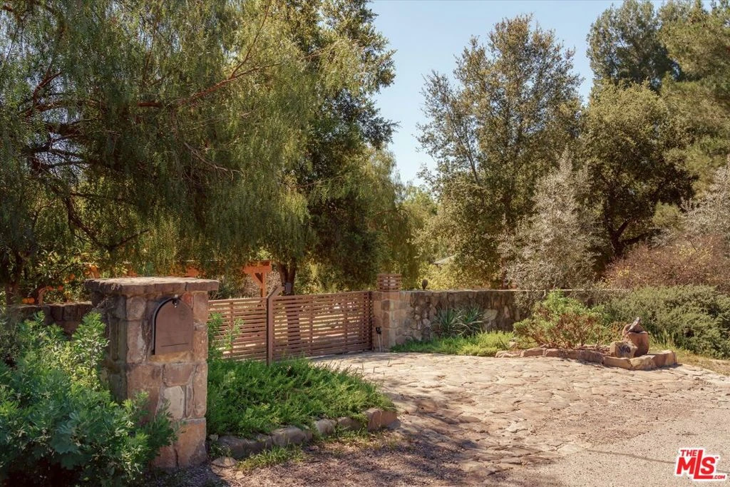 Set behind gates on over an acre of land in Ojai's coveted and ultra-private East End, this architectural compound features a modern and soulful main house and a separate guesthouse. The move-in-ready property offers a rare sense of seclusion and peace, minutes from town, on a lush parcel that is your own creative retreat. The main residence is set far back from the street and features 4 bedrooms, 3 baths, and a den and offers a versatile floor plan that could accommodate any number of scenarios. The luminescent primary suite occupies the entire upper floor of the house - with walk in closet, sitting room/office, balconies and a luxurious bathroom with double sinks, a magnificent corner tub - featuring treetop and mountain views - and separate shower. Downstairs, from the living room, dining room, kitchen and secondary bedrooms, expansive wood framed windows and doors frame lush green views in every direction. The indoor /outdoor flow is fantastic throughout, almost every room provides access to nature outside. Exquisite handcrafted RTK tile, made in Ojai, adds an authentic and artistic touch throughout and is featured in all of the bathrooms, including the guest cottage, as well as the entry and the pool. The expansive grounds unfold into a series of inviting outdoor spaces. A sparkling pool and spa, complemented by a shady pergola and an adjacent covered pavilion (useful as an outdoor gym/sauna/cold plunge area, ping pong venue, al fresco massage room or yoga space) and multiple areas for dining, lounging, and gathering under the open sky or shade trees. Beyond, a peaceful meadow and open land provide room to wander, rest or play. Magic is everywhere. Rows of blossoming citrus trees dot the landscape, filling the air with fragrance and offering seasonal abundance, along with countless native plants and mature trees. Adding to the compound's appeal is a 1920's vintage 2-bedroom bungalow, enchanting in both character and potential. Ideal for guests, extended family, or as an income opportunity. It provides a flexible and private secondary living space with full kitchen, eating nook, full bath and bonus built-in bunk beds. This legacy property is a truly special offering that captures the essence of Ojai - serene, private, emotional, light, inspiring and effortlessly livable.