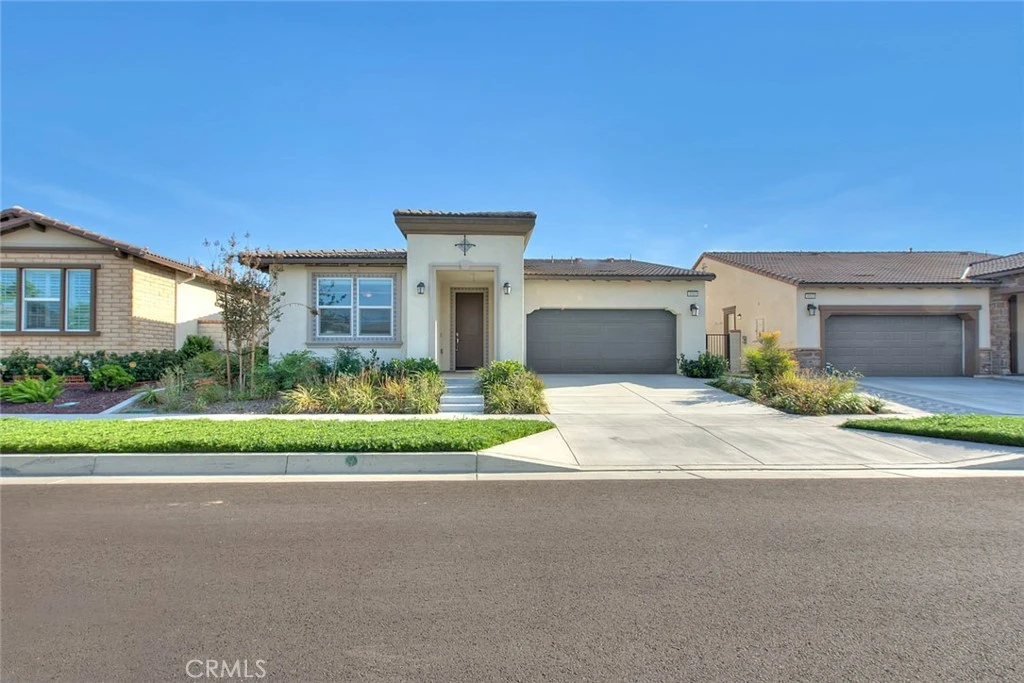****MAJOR PRICE ADJUSTMENT****This single story, 1556 sq.ft., 2 bedroom, 2 bath home is located in highly desired, 55 plus, gated, master planned Lennar community of Esperanza in Ontario Ranch. The kitchen, dining area and family room combine to form an open concept great room. The kitchen is complete with matching stainless G.E. appliances, double oven, microwave, dishwasher, 5 burner stovetop with hood and refrigerator. The center island doubles as a breakfast bar. There is a walk-in pantry, quartz counter tops and wood-like laminate floors throughout with carpet in the bedrooms. There is a separate laundry room, multiple storage closets, ceiling fans in the bedrooms and family room, recessed lighting, a fire sprinkler system, tankless water heater, high 9 foot ceilings, and a low maintenance front yard with drought resistant vegetation. The oversized primary bedroom boasts an attached bath with a dual sink vanity, a walk-in shower, separate toilet and large walk-in closet. The spare bathroom has a tub/shower combo. The spare bedroom is carpeted and has a ceiling fan with light. Dual sliding glass doors lead to a covered patio and backyard tastefully finished with artificial turf and river rock and block wall surrounds. The HOA community includes a 9,000 sq.ft. La Jolla Clubhouse, swimming pool, fitness center, BBQ area, fire pit, pickleball courts and dog park. This home is conveniently located close to multiple retail and grocery shopping centers and Ontario Airport.
