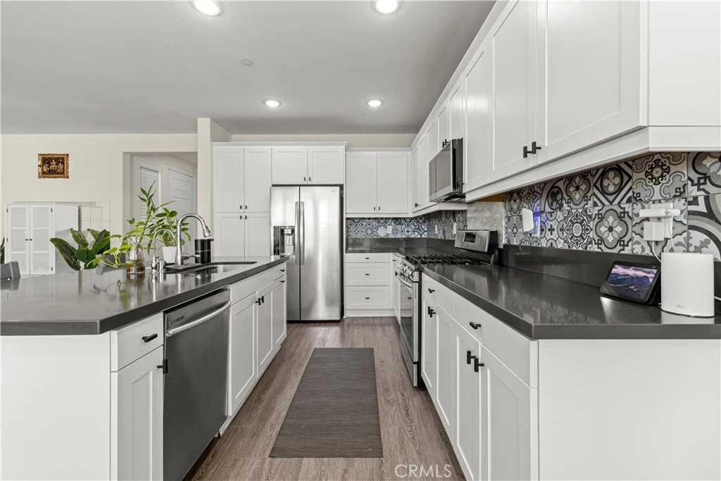Welcome to 4961 Monarch Place, one of the most desirable homes in the Park Place master planned community in Ontario Ranch. This beautifully maintained residence offers 4 bedrooms and 3 bathrooms with approximately 2,299 square feet of bright and open living space. The spacious great room and dining area create an ideal setting for entertaining, while the gourmet kitchen features timeless white cabinetry, a vintage inspired art deco tile backsplash, quartz countertops, stainless steel appliances, and an oversized island. The first floor includes a convenient bedroom and full bathroom, perfect for guests or multi-generational living. Upstairs offers a dedicated laundry room, a spacious loft ideal for a home office or flex space, and a private primary suite with a walk-in closet and an en suite bathroom featuring a soaking tub, separate shower, and dual vanities. Additional highlights include recessed lighting, custom interior paint, and wood flooring throughout. Residents enjoy resort-style amenities including a 14,500 square foot recreation center with a fitness center, movie theater, and library, along with sport courts, dog park, pool, and spa. Conveniently located near freeways, schools, shopping, and dining.