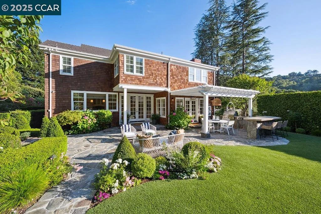 Perfectly positioned at the end of a quiet street, this Hamptons-inspired home delivers exceptional living on .75± acres in coveted Orinda Downs. The beautifully appointed 4,032± sq. ft. main house plus 625± sq. ft. guest house showcases impeccable craftsmanship with custom millwork and classic shingle exterior. Six bedrooms and six bathrooms provide generous space across thoughtfully designed rooms. The formal living and dining rooms flow seamlessly to the chef's kitchen and family room, while French doors throughout create that essential indoor-outdoor California lifestyle. The spacious primary suite features built-in storage, a beautifully updated bath, and an enviable walk-in closet. The flexible floor plan includes four additional bedrooms, a second family room, home office, plus a separate 1-bedroom, 1-bathroom guest house ideal for guests or extended family. The backyard is an entertainer's dream. Custom bluestone hardscape surrounds the newly updated rectangular pool (2025) and separate spa. The built-in outdoor kitchen sits beneath a striking arbor, there's an actual putting green, and the dining areas capture Lamorinda's perfect climate. This is where summer pool parties happen naturally, where dinner stretches into evening, where gardens bloom with picturesque views.