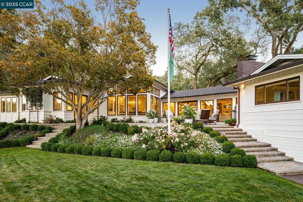 On a quiet cul-de-sac, this home surveys Orinda CC’s 6th-9th holes. Despite the Club proximity, the home offers exceptional privacy. Enter, and the welcoming Great Room (under elevated beamed ceilings) beckons. It seamlessly blends the remodeled kitchen (featuring exceptional countertops and appliances); a bar seating at least 5; the dining room, surveying the golf course and yard; and glass doors to the deck. Outside, a firepit keeps guests warm; a gazebo commands golf course and swimming pool views; the garden offers quiet solitude; and the patio accommodates outdoor gatherings and al fresco dining. Four bedrooms lie on the main floor. The principal suite overlooks the golf course. Two huge closets accommodate wardrobes of any size. The principal bath offers aroma therapy, a steam shower, and a stand-alone tub. Three other bedrooms and two bathrooms lie at the other end of the home, each with garden views, and one – a second primary suite – has pool and golf course views, a sitting room/nursery, and patio access. Closet space abounds. The lower level features a remodeled guest suite with a kitchenette (with top appliances and new quartz countertops), en-suite bath, fireplace, and office area. The entire home was remodeled and the roof replaced in 2019.