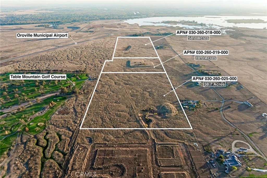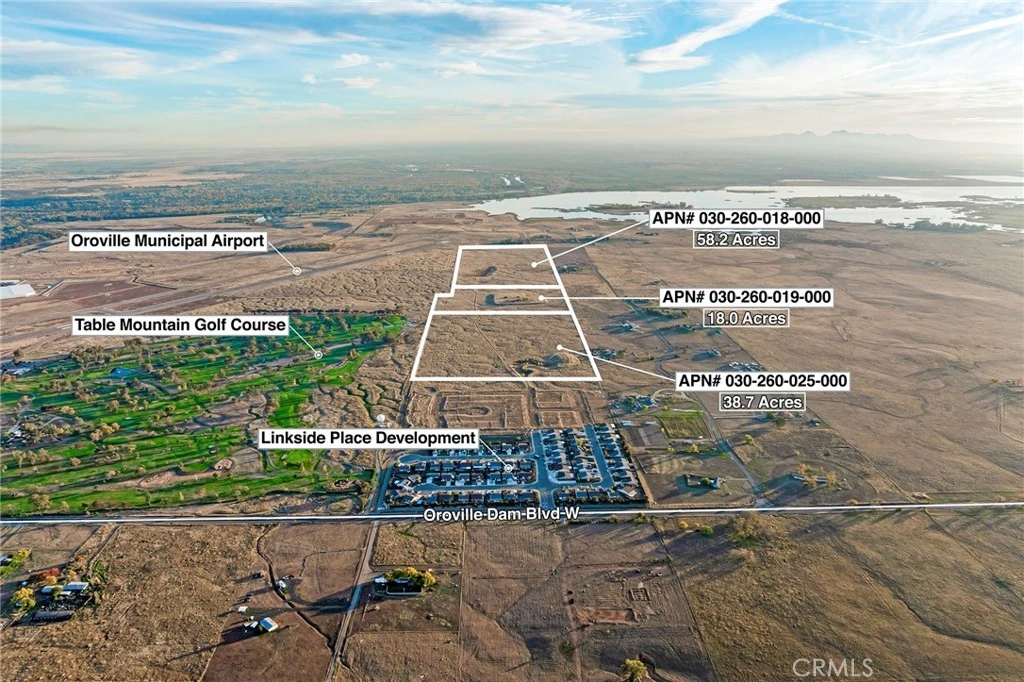 OWNER MAY FINANCE! PRIME DEVELOPMENT OPPORTUNITY with this 115± acre land offering located at the edge of the Oroville City Limits and directly adjacent to the 18-Hole Table Mountain Golf Course. Featuring approximately 2,200 feet of golf-course boundary frontage, this property presents exceptional potential for a rural-residential or golf-oriented development concept, including 5-acre estate lots under the current RR-5 zoning. The land borders Linkside Place Phase II to the north, including the tentatively approved Linkside Place Phase II subdivision consisting of 56 future homesites. Phase II has underground utilities already installed and roads graded, awaiting paving, signaling strong forward momentum for continued residential growth in this corridor. Linkside Place Phase I, just north of Phase II, was completed in recent past with 65 homes and demonstrates proven development success in this immediate area. This prime 115± acres is made up of three legal parcels: APN 030-160-019 (18.08± acres), APN 030-260-025 (38.79± acres), and APN 030-260-018 (58.24± acres). Just over 1,000 feet west lies the previously City-approved 421-acre Oro Bay master plan area, once approved for approx. 2,400 homes, showing the long-term development vision for this part of Oroville. Power, water, and sewer currently extend to Linkside Place Phase II at the northern boundary of this property. With Oroville’s growing population, multiple new housing projects underway, and demand for quality development opportunities, this acreage sits directly in the path of expansion. Located just south of Oro Dam Blvd, the main connector between Highways 70 and 99, and approximately 4 miles to downtown Oroville, 25 miles to Chico, and 70 miles to Sacramento. Close to recreation including Lake Oroville, the Feather River, and the Afterbay recreation and boat launch facilities just up the road. Ideal for developers, investors, 1031 exchanges, or long-term land banking. Owner may finance a significant portion—submit terms for seller consideration. Priced at right around $20,000+/- per acre. Inquire with City Of Oroville for discussions on their current plans for this area on Annexation Into City Limits & Potentail Future Rezoning Ideas in conjunction with adjacent developments. OWNER MAY FINANCE WITH LARGE DOWN ON NEGOTIATED TERMS. INQUIRE FOR DETAILS.