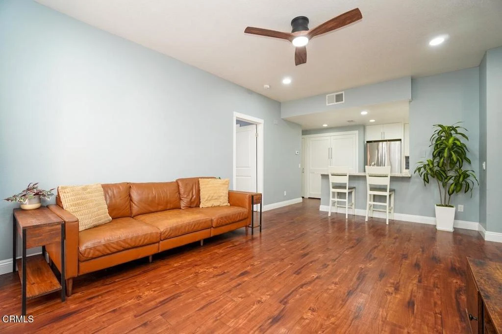 Charming remodeled single level home located in the North Oxnard community of Las Brisas. Front gate opens up to the front porch enclosed patio with deck tiles, faux green walls, flower pots and a seating bench. Enter the home via the security screen door and in to the open living area featuring luxury English Walnut vinyl flooring with 5 inch baseboards, a walk-in coat closet with lighting, wall niche and a ceiling fan. The beautiful modern kitchen is renovated with custom Kraftmaid Shenandoah shaker style white cabinets complete with under lighting, large stainless hardware, Lazy Suzans and corner shelves fully utilizing all available storage space. The kitchen is also updated with designer recycled glass Quartz counter-tops, blue subway tile backsplash, stainless steel appliances with convection oven, stainless faucet and sink, and a quiet Sinkerator disposal. The spacious bedroom features dual closets, a ceiling fan and a custom dual layer drywall for added sound reduction.The split bathroom design has one area with a tall storage cabinet, a newer vanity with a marble counter, Moen faucet and soft closing drawers. The second area features a shower stall with sliding glass doors, large ceramic tile surround, mosaic tile accent with niche, a low-flow water efficient toilet, and a high capacity humidity sensor ventilation fan. Other features include newer electrical outlets and light switches, indoor laundry and water heater closets with sensor lighting, solid core raised panel doors. and an attached garage with floor tiles and storage spaces. Community amenities include a heated pool & spa with outdoor shower, BBQ area and 2 playgrounds. The homeowners association provides trash pickup, property insurance, landscape maintenance, security patrol and basic cable with Showtime. The home is a short drive to freeway access as well as shopping, dining and entertainment at The Collection and Esplanade shopping centers