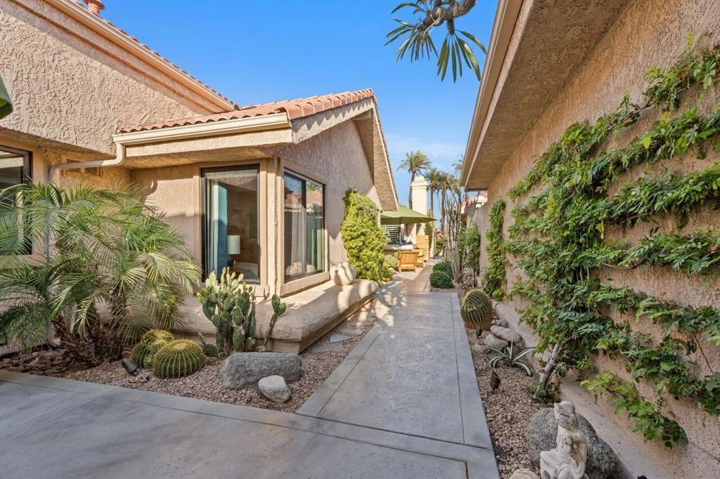Welcome to Silver Sands RC, THE BEST RACQUET CLUB in the valley! 2 professional coaches onsite, instructional classes and special events. Prime location in Palm Desert, close to El Paseo shopping, adjacent to JW Marriott, across from Desert Willow Golf Resort where Palm Desert residents receive reduced rates. This home is unattached. 1992SF home has 3 bed/3 baths, 2 Patios, Private Courtyards plus an Atrium. Light and Bright decor, professionally decorated. Upgrades include kitchen cabinets, New Quartz countertops, Vinyl Plank flooring, natural wood look, throughout ,tile flooring in bathrooms. Breakfast nook in kitchen, bench seating around table. Fireplace has white Stack Stone reface. Enjoy mountains views from the extended back patio. Center Courtyard concrete and tiles refinished last year. New metal gates replaced for privacy. Stainless Appliances, Blue Star Range, New Refrigerator, Bosch DW, completes the Cooks Kitchen. On-suite bathrooms for each bedroom. Built in desk and storage cabinets in third bedroom for office. Plenty of storage primary bedroom has walk in closet, plus a wardrobe cabinet included with purchase.Community has a combination of Desert Landscape and matured shade trees, Green Grassy Greenbelts in the community areas. HOA includes, 8 lighted courts, Gym, 15 heated Pools and Spas. Maintenance and replacement of Roofs, Stucco siding, Exterior Painting, community Pest service, Front and Back Landscape maintenance and Cable-Internet is provided by the HOA. Clubhouse activities and Seasonal events are planned by the Social Committee. 2 car garage, new storage cabinets, work bench and storage rack above. The inside laundry room, utility sink, storage. Water softener tank in garage, serviced by Culligan Water.Air conditioner, Furnace, Hot Water Tank, purchased new in 2018-2019. Don't miss this RARE OPPRTUNITY TO OWN the largest floor C plan in a condo community. Secure gated community .Call first to make an appointment. Seller is a Real Estate Agent and a local Interior Designer.