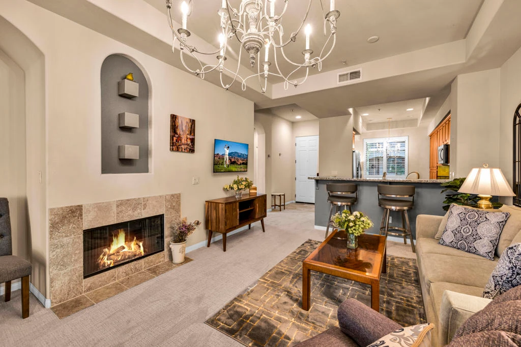 Embrace desert living in this upgraded and inviting 1 bedroom, 1-bathroom great room condo in the prestigious Villa Portofino, an active senior community. Excellent Palm Desert location near shopping, dining and more. Enter the tastefully appointed ground level unit and immediately feel the comforts of home with tray ceilings, New carpet, tile rimmed gas fireplace, wet bar and French doors leading to west facing back patio with peek-a-boo mountain views. Spacious kitchen has granite slab counters, stainless steel appliances. Nice tile floors, plantation shutters, pantry, breakfast nook with morning sunshine plus breakfast bar. Master bedroom with southern mountain view and walk-in closet. Bathroom with stylish step in shower, soaking tub, two vanities with granite counters. Stacked washer and dryer. Newer Trane air conditioner. 1 assigned covered carport space. Furnished per inventory list. Villa Portofino has a wonderful community area. A barbecue area, with panoramic mountain views, Start enjoying the good life. Villa Portofino offers an unmatched lifestyle with a 30,000 sq. ft. clubhouse boasting two restaurants, a private theater, fitness center, game room, pool & spa, bocce ball, shuffleboard, and a vibrant social calendar. HOA dues cover cable, water, trash, landscaping and clubhouse access. Located minutes from El Paseo's luxury shopping and dining, Eisenhower Medical Center, and Bristol Farms. Easy to show. 55 and over.