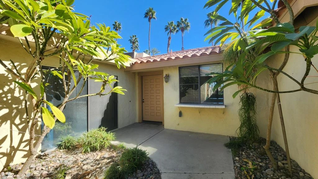Welcome to resort-style desert living in this 2-bedroom, 2-bath condo offering 1,303 sq ft in a private golf community. Vaulted ceilings and an open layout create a bright, airy feel, complemented by soft neutral tones and tasteful finishes throughout. The kitchen features stainless steel appliances and a newer refrigerator, offering modern convenience with timeless style. Enjoy a peaceful interior location with desirable eastern exposure, overlooking wide fairways of the South Course and stunning mountain views from your private patio. Ideally located near the community pool, with access to a clubhouse and fitness center. Perfect as a full-time residence or seasonal getaway, this home offers comfort, views, and the lifestyle everyone comes to the desert for.