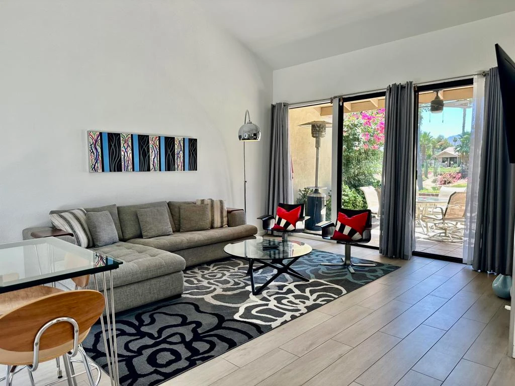 You'll fall in love with the stunning views of the golf course, water, and mountains from this sleek, modern 30 Plan. This 2-bedroom plus den (which the owner has placed a bed in) unit features an updated kitchen with custom white cabinets, stainless steel appliances, and elegant quartz countertops. The vaulted beamed ceilings and open floor plan create a bright, inviting atmosphere. The master bedroom boasts two spacious closets and an en-suite bathroom with a large tiled shower and double vanities. The den features custom built-ins & a working desk! Don't miss out--call today!