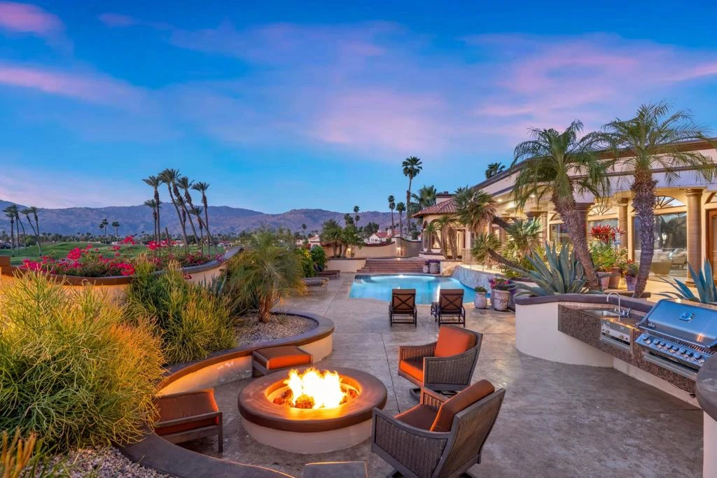 -Spectacular Mountain & Golf Course View Estate -Offering breathtaking panoramic mountain and golf course views, this remarkable 7,185 square foot custom estate is the most distinctive residence in Desert Falls Estates. Originally constructed by the developer of Desert Falls Country Club as his personal residence, the home was thoughtfully designed to capture the beauty of the surrounding views while offering exceptional scale, privacy, and luxury.Arrival begins through a private gated courtyard highlighted by a dramatic fountain that creates an elegant and tranquil first impression. Inside, the home opens to a grand great room with expansive living spaces, featuring a formal living area with fireplace and a spacious dining room designed to comfortably accommodate gatherings of ten or more guests. Walls of glass frame sweeping views of the pool, golf course, and the dramatic mountain backdrop, filling the home with natural light and creating a truly unforgettable setting.The expansive chef's kitchen is designed for both everyday living and large-scale entertaining. A generous breakfast island serves as the centerpiece, offering stunning views while providing abundant preparation space. The kitchen also includes a charming breakfast area with its own fireplace--perfect for relaxed mornings while enjoying the surrounding scenery and pool area.Outdoor living is equally impressive. The home features a large multi-level pool and spa retreat designed for entertaining, complete with an outdoor fireplace, multiple lounge areas, and exceptional privacy. Surrounded by sweeping mountain vistas and lush golf course greens, this outdoor environment offers an ideal setting for both intimate relaxation and memorable gatherings.The luxurious primary suite is a private retreat offering exceptional scale and comfort. The spa-inspired primary bath features a marble soaking tub, dual island-style vanities, an oversized walk-in shower, and two spacious walk-in closets. This suite also includes a versatile private room with fireplace, ideal for a home office, media lounge, or quiet sitting room.Additional amenities include three junior suites, a home gym, game and media suite, and an elegant wet bar, creating abundant space for both family living and entertaining. Designed with seamless indoor-outdoor flow, the residence offers an exceptional lifestyle of comfort, privacy, and desert elegance.Offered Furnished
